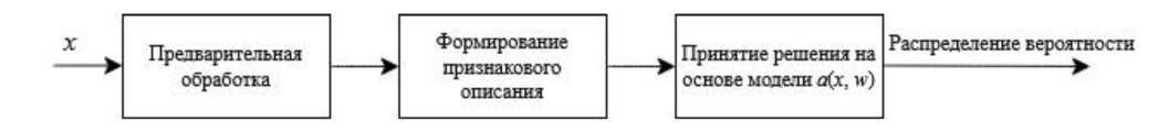 На рис. 2 x является конечной последовательностью сетевых дампов данных, a (x, w) в общем виде является самой моделью классификатора, где x – признаки объекта, а w – неизвестные параметры [6, 7]. В процессе обучения модели для идентификации сетевых приложений выполняется поиск критериев оптимальности модели: