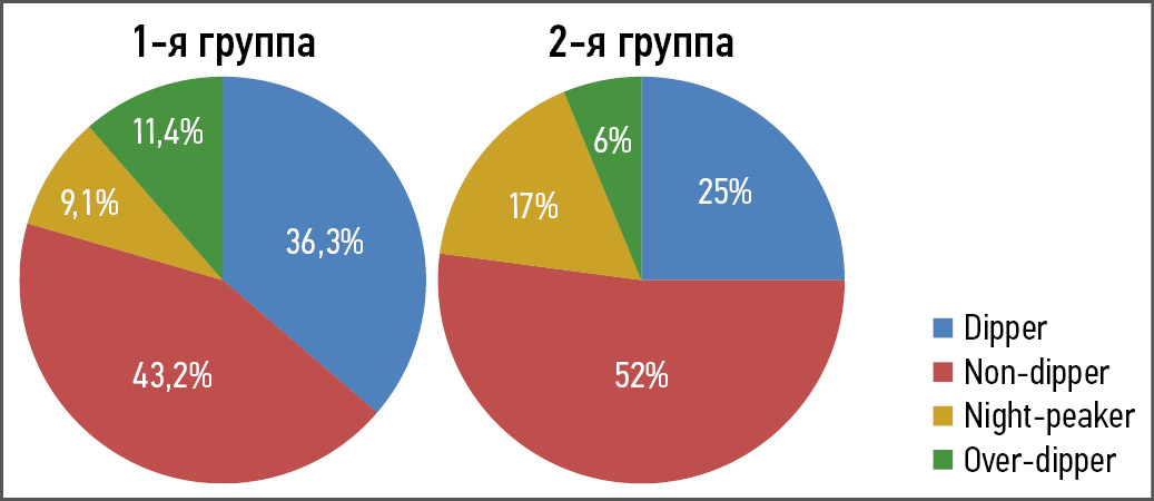 При анализе результатов СМАД (табл. 2), помимо статистически значимого повышения среднесуточных значений САД и ДАД, а также индексов нагрузки давлением, в группе неконтролируемой резистентной АГ нами обнаружено существенное повышение величины и скорости утреннего подъёма АД, пульсового АД и величины суточного индекса для САД. Кроме того, во 2-й группе оказалась статистически значимо выше вариабельность САД днём и ночью. Анализ циркадного профиля АД (рис. 1) показал, что в обеих группах чаще встречались такие неблагоприятные варианты суточного профиля АД для САД, как non-dipper (43,2% в 1-й группе и 52,1% – во 2-й; р=0,012) и night-peaker (9,1% в 1-й группе и 16,7% – во 2-й; р=0,03).