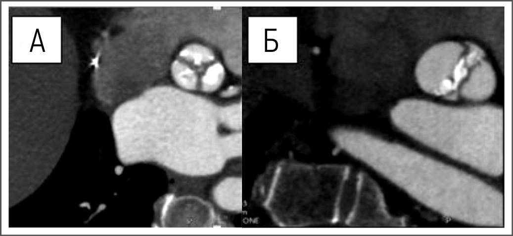 Рис. 2. Оценка строения аортального клапана с помощью мультиспиральной компьютерной томографии. А – аортальный клапан с трёхстворчатым строением, Б – аортальный клапан с двустворчатым строением. / Fig. 2. Assessment of the structure of the aortic valve using multispiral computed tomography. A – aortic valve with a tricuspid structure,B – aortic valve with a bicuspid structure.
