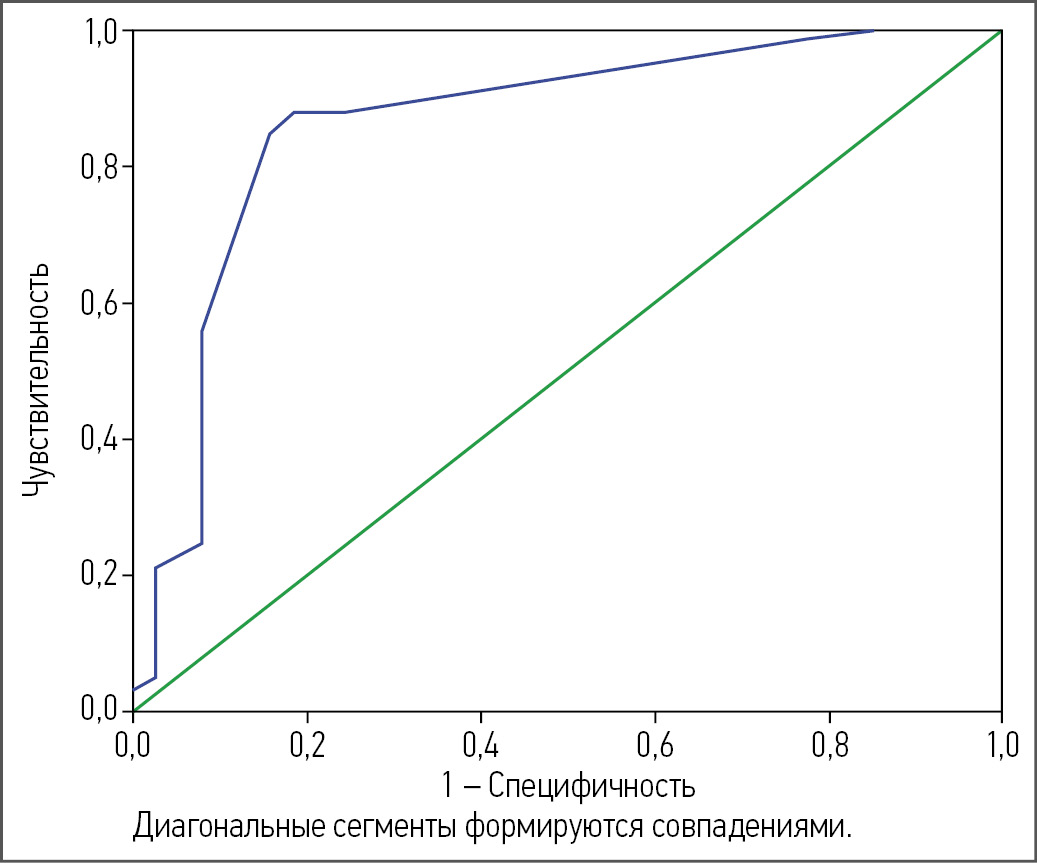 Рис. 3. Кривая ROC-анализа прогнозирующей способности показателя AТ/ET у пациентов с трёхстворчатым строением аортального клапана. / Fig. 3. Receiver operating characteristic curve of the predictive ability of the AT/ET index in patients with tricuspid aortic valve structure.