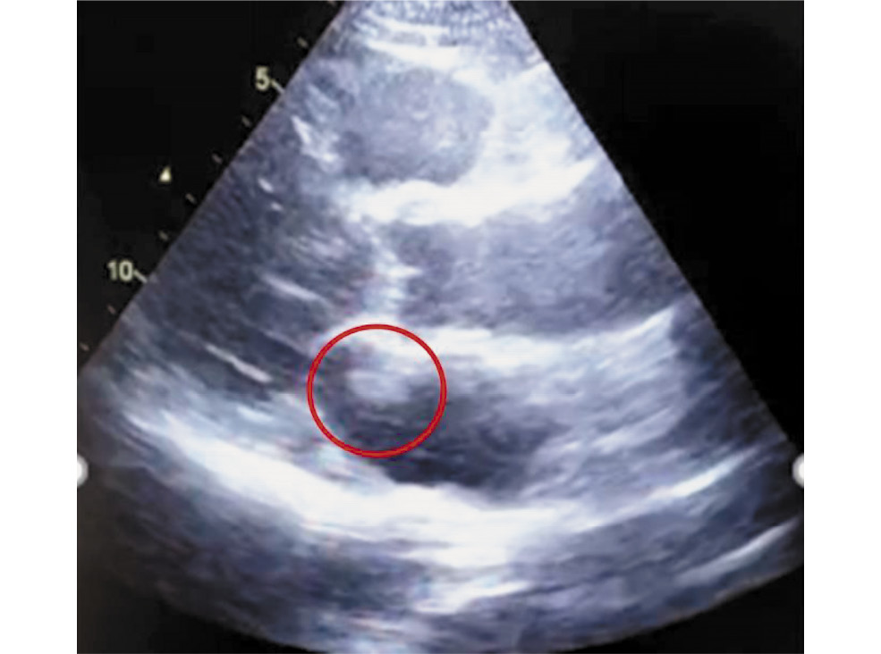 ЛЖ не увеличен. Имеет место его концентрическое ремоделирование. ЛП умеренно увеличено. В полости ЛП, в области срединной части межпредсердной перегородки (МПП) лоцируется образование неправильной формы размером около 10 мм, рыхлое, с мелкими флотирующими фрагментами, фиксированное к МПП (тромб? миксома?) (рис. 1). Аорта не расширена. Клапан трёхполулунный, не изменён. Нарушений кровотока не установлено. Створки митрального клапана не изменены. Имеется регургитация 1-й ст. Правые отделы сердца не расширены. Глобальная сократимость правого желудочка не снижена. Пульмональный и трёхстворчатый клапаны обычные. Лёгочный ствол не расширен. Нижняя полая вена не расширена, спадается более 50%. Расчётное систолическое давление в лёгочной артерии — 30 мм рт.ст. Межпредсердная перегородка тонкая, патологического сброса через неё не найдено. Избытка в полости перикарда нет.