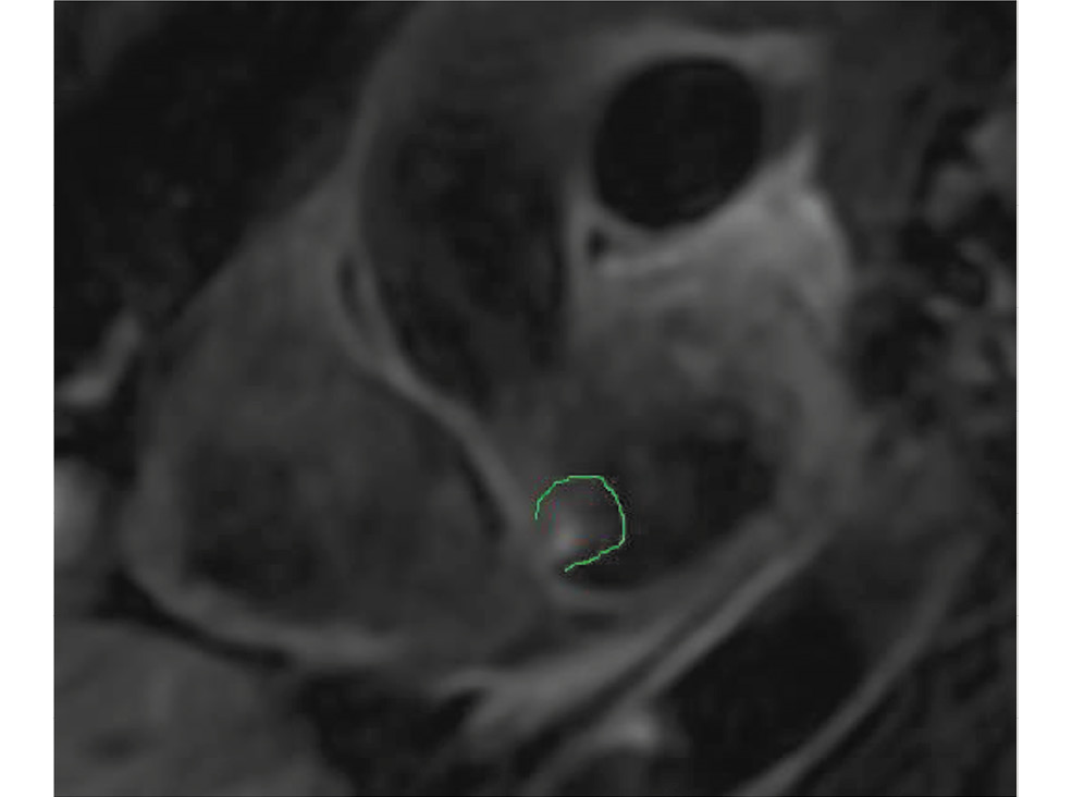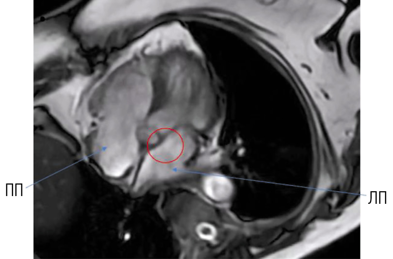 Для окончательной верификации образования в ЛП (тромб / миксома), определения его размеров и выбора дальнейшей тактики лечения была проведена МРТ сердца с гадолинием. По результатам исследования: МР-признаки мелкого образования ЛП, по МР-характеристикам более соответствующего миксоме — мелкое флотирующее образование неправильной формы ориентировочного размера 10×12 мм, фиксированное на уровне средней / нижней трети МПП и направленное в полость ЛП (рис. 2). Образование состоит из «ножки» размером 5×5 мм с изоинтенсивным МР-сигналом на DIR-ИП (импульсная последовательность в режиме Double Inversion Recovery) и гиперинтенсивным — на TIR-ИП (Tau Inversion Recovery), T2 FS-ИП (Fat Suppression), и более «рыхлой» части, слабо дифференцирующейся на киноизображениях и имеющей слабогиперинтенсивный МР-сигнал на TIR-ИП (на рис. 2 — МР-картина постишемического практически трансмурального рубца — нежизнеспособный миокард) в 7-м сегменте передней стенки ЛЖ, наблюдается концентрическая гипертрофия миокарда ЛЖ.