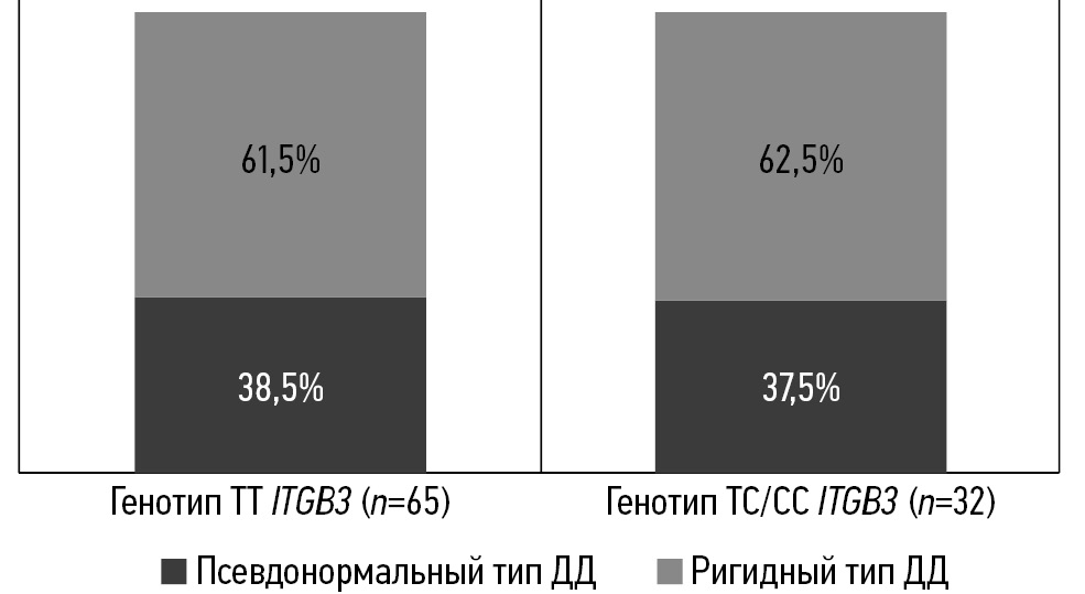 Более высокая частота развития псевдонормальной ДД пациенток с вариантами ТС и СС ITGB3 говорит о значимой роли носительства аллеля С в нарушении диастолической функции ЛЖ.