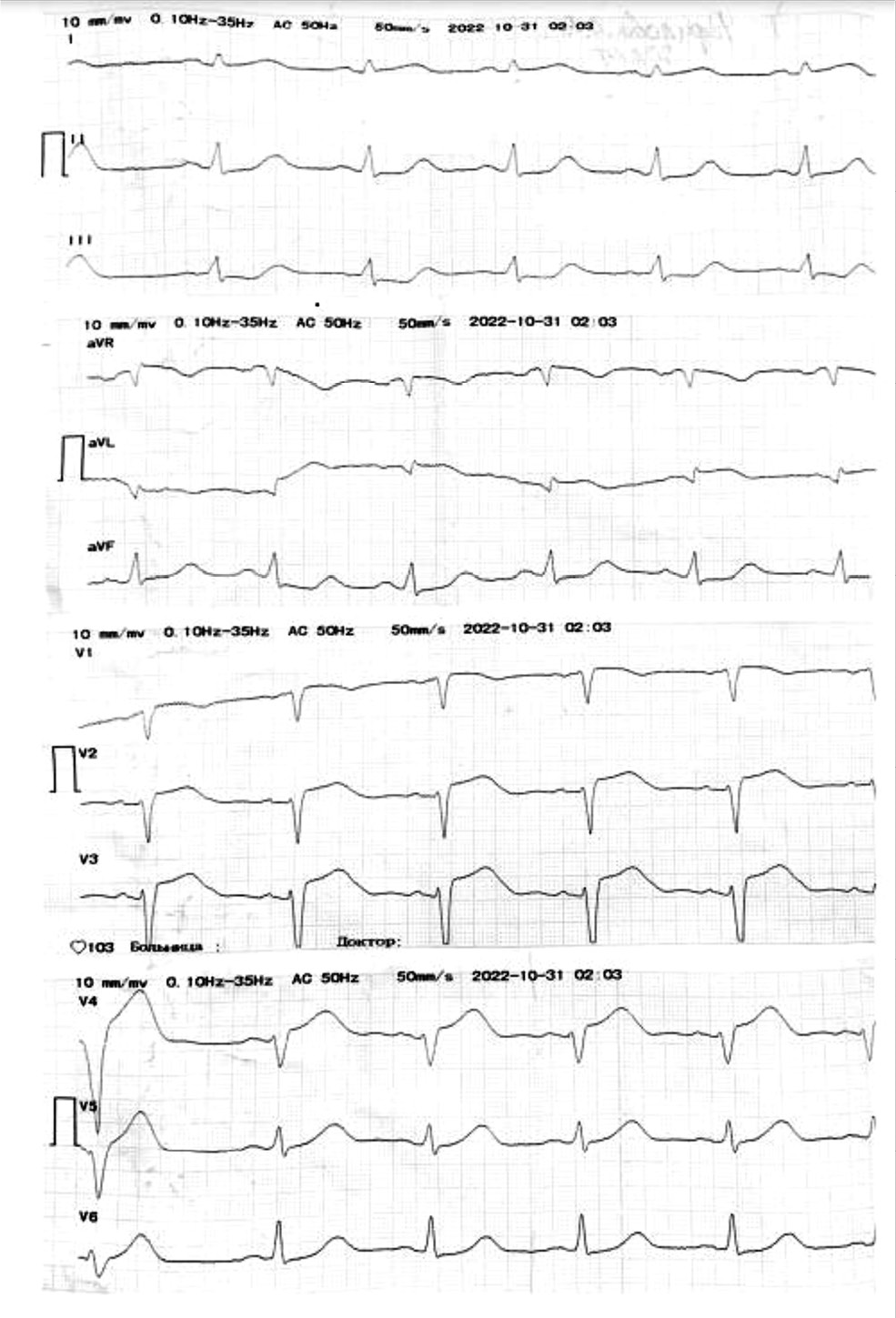 При осмотре в КМКБСМП им. Н.С. Карповича жалоб на ангинозные боли не предъявляла, одышки в покое не было. Респираторно и гемодинамически стабильна. По ЭКГ — ритм синусовый, с частотой сердечных сокращений (ЧСС) 85 уд./мин, электрическая ось сердца не отклонена, отмечены подъём сегмента ST до 2–3 мм в отведениях I, aVL, V1–V4 с реципрокными изменениями в виде депрессии сегмента ST до 2 мм в отведениях II, III, aVF, V5–V6, rS V1–V4, QR aVL, а также одиночная желудочковая экстрасистола. Поставлен диагноз: «Острый коронарный синдром с подъёмом сегмента ST по передней стенке от 30.10.2022» (рис. 1). Пациентка в экстренном порядке подана в рентгеноперационную для проведения коронароангиографии (КАГ) в сопровождении 2 анестезиологов-реаниматологов.