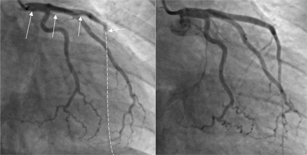 В 1-е сут у пациентки на фоне относительно стабильного состояния отмечено 2 пароксизма желудочковой тахикардии с переходом в брадикардию, развитие гипотонии. В экстренном порядке подключена инотропная поддержка 2 кардиотониками, установлен временный электрокардиостимулятор. По ЭКГ — отрицательная динамика в виде увеличения подъёма сегмента ST до 6 мм (при поступлении — 3 мм), частая полиморфная желудочковая экстрасистолия. По причине развития жизнеугрожающих нарушений ритма сердца, кардиогенного шока было принято решение о проведении контрольной КАГ с целью исключения тромботических окклюзий коронарных артерий. По результатам КАГ: стенты ПМЖВ проходимы, без признаков тромбоза; отмечается замедление кровотока по ПМЖВ; диссекция ствола ЛКА типа «В» с переходом на проксимальную часть ОВ, диаметр ствола ЛКА — 5,5–5,7 мм — без отрицательной динамики от предыдущей КАГ.
