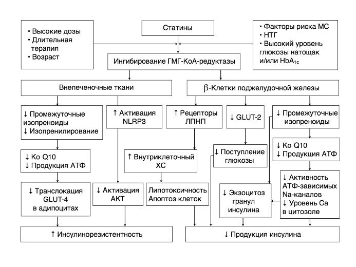 Статины способны влиять на гликемический контроль за счет уменьшения синтеза промежуточных метаболитов мевалоновой кислоты, таких как изопреноиды, фарнезилпирофосфат, геранилгеранил пирофосфат и Ко Q10 или убихинон. Угнетающее действие статинов на белок-переносчик глюкозы GLUT-2 замедляет поступление глюкозы в b-клетки поджелудочной железы, что вызывает, как следствие, снижение секреции инсулина. Избыточное поступление в b-клетки ЛПНП также угнетает активность глюкокиназы, участвующей в фосфорелировании глюкозы. Уменьшение выработки АТФ вследствие недостатка Ко Q10 может привести к нарушению работы АТФ-зависимых калиевых каналов, глюкозозависимого увеличения содержания внутриклеточного кальция и снижению секреции инсулина путем экзоцитоза. Нарушение синтеза изопреноидов приводит к уменьшению экспрессии GLUT-4 и снижению поступления глюкозы в адипоциты, где она превращается в жирные кислоты и хранится в виде ТГ. Кроме того, активация белка NLRP3 приводит к снижению активности фермента АКТ, участвующего в окислительном фосфорелировании. Как следствие – формируется инсулинорезистентность внепеченочных клеток, преимущественно адипоцитов [22, 23].