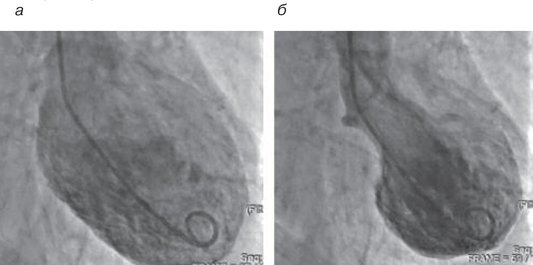 Рис. 2. КВГ: a – диастола; б – систола. Отмечается акинезия верхушки, верхушечных и срединных сегментов всех стенок ЛЖ, гиперкинезия базальных отделов ЛЖ.