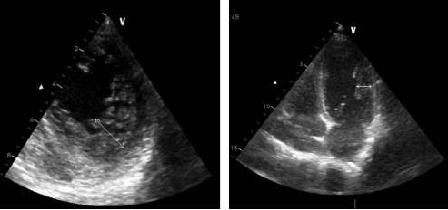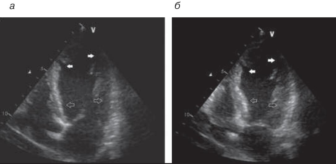 Рис. 3. ЭхоКГ на 2-е сутки из апикального доступа, левый желудочек: а – диастола; б – систола. Белые стрелки – зоны гипокинезии срединных сегментов.