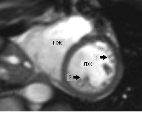 Рис. 6. МРТ сердца, короткая ось, срез на уровне средней трети ЛЖ: 1 – некомпактный слой миокарда; 2 – трабекула.