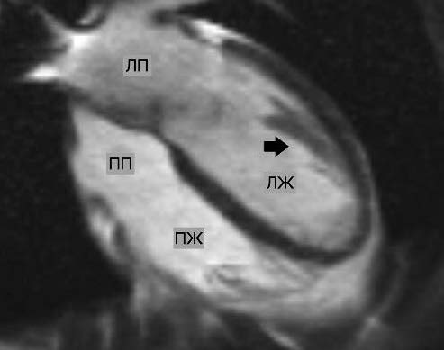Рис. 7. МРТ сердца, четырехкамерный вид. Стрелкой указаны трабекулы.