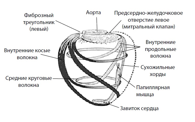 О том, что миокард при сокращении совершает скручивающие движения, известно давно, но оценить это явление известными неинвазивными методами не представлялось возможным. В процессе изучения данного механизма стало понятно, что мышечные волокна миокарда различаются по длине, толщине и собраны в пучки, располагающиеся в 3 направлениях. На макроскопическом уровне можно выделить 3 различных слоя миокарда: поверхностный, средний и внутренний. В поверхностном слое мышечные волокна имеют наклонное направление от основания к верхушке относительно вертикальной оси. Мышечные волокна на грудино-реберной поверхности сердца расположены справа налево, тогда как на диафрагмальной – слева направо, при этом они покрывают миокард желудочков в форме спиралей. В момент достижения мышечными волокнами верхушки сердца они проникают в так называемую субэндокардиальную зону. Мышечные волокна среднего слоя имеют преимущественно поперечное направление. Волокна глубокого слоя миокарда ЛЖ имеют ход, противоположный мышечным пучкам поверхностного слоя. Они поднимаются от верхушки к основанию, формируя папиллярно-трабекулярный аппарат и субэндокардиальную зону ЛЖ (рис. 1). Особенности расположения миокардиальных волокон в ЛЖ приводят к тому, что у здорового человека во время сокращения он совершает движение в 3 направлениях: радиальном, циркулярном и продольном [5, 6].
