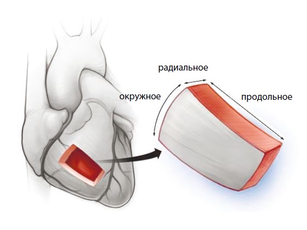 Рис. 2. Деформация миокарда происходит в продольном (от основания до вершины), радиальном (или «поперечном») и окружном измерении (окружающем короткую ось сердца) [ 14].