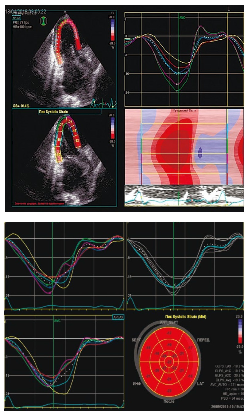 Рис. 3. Speckle tracking-ЭхоКГ: определение глобальной продольной деформации.