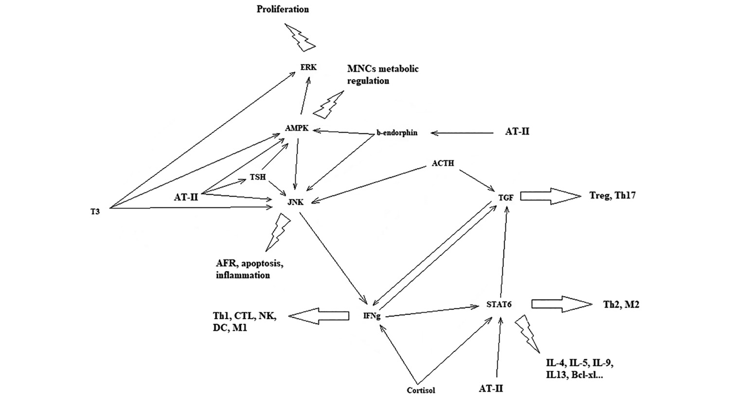 Note. ACTH — adrenocorticotropic hormone, TSH — thyroid-stimulating hormone, Th1 — T-helper type 1, CTL — cytotoxic lymphocytes, Th2 — T-helper type 2, Treg — T-regulatory lymphocytes, Th17 — T helper 17, TGF-β1 — transforming growth factor β1, IFN-γ — interferon-γ, M1 — macrophages of M1 phenotype, M2 — macrophages of M2 phenotype, DC — dendritic cells, NK — natural killer cells, MNCs metabolic regulation — metabolic regulation of mononuclear cells, AFR — acute phase response. The symbol