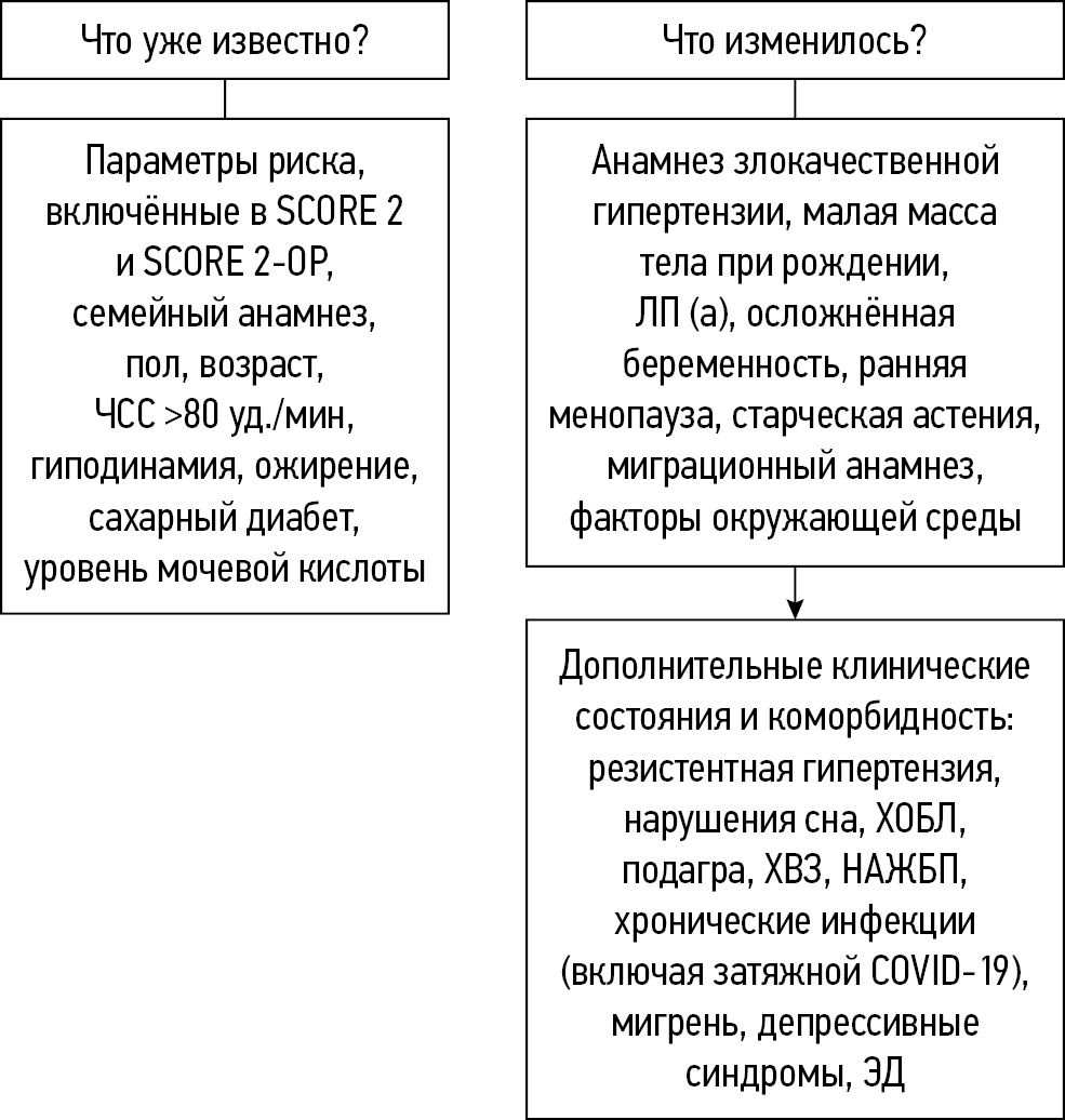 Note. SCORE 2 (Systematic Coronary Risk Evaluation 2) and SCORE 2-OP predict the 10-year risk of fatal and nonfatal cardiovascular events in people aged 40–69 (SCORE2) and 70 years and older (SCORE 2-OP). ЧСС — heart rate, ЛП (а) — lipoprotein (a), НАЖБП — non-alcoholic fatty liver disease, ХВЗ — chronic inflammatory diseases, ЭД — erectile dysfunction, ХОБЛ — chronic obstructive pulmonary disease.