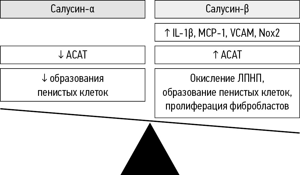 C. Zhou и соавт. анализировали экспрессию салусина-β в сосудистых тканях мышей с дефицитом рецепторов ЛПНП [LDLR (-/-)] и оценивали влияние салусина-β на развитие атеросклероза у этих мышей. Экспрессия салусина-β была повышена у мышей LDLR (-/-). Подкожная инъекция салусина-β значимо усугубляла атеросклеротические поражения и увеличивала отложения липидов в артериях у мышей LDLR (-/-). Более того, салусин-β значительно повышал концентрацию ЛПНП в сыворотке крови. Эти результаты свидетельствуют о том, что повышенная экспрессия салусина-β способствует прогрессированию атеросклероза у мышей LDLR (-/-) за счёт повышения уровня ЛПНП в крови. Согласно данным этого исследования, салусин-β можно рассматривать как потенциальную терапевтическую мишень для профилактики и лечения атеросклероза [34]. M.Nagashima и соавт. исследовали влияние салусина-α и -β на образование атеросклеротических бляшек in vivo у мышей с дефицитом аполипопротеина-Е (АроЕ-/-). Четырёхнедельная инфузия салусина-β привела фактически к двукратному увеличению образования пенистых клеток, усиленной активизации рецепторов-«мусорщиков» (SR) и ACAT-1. Напротив, салусин-α снижал уровни общего холестерина в сыворотке крови на 15% и образование пенистых клеток на 68%, что было связано с подавлением ACAT-1. Это исследование предоставило доказательства того, что салусин-β ускоряет развитие атеросклеротических поражений, связанных с активацией SR и ACAT-1 у мышей ApoE-/-, в то время как салусин-α оказывает антиатеросклеротическое действие, снижая содержание общего холестерина в сыворотке крови и интенсивность экспрессии ACAT-1 [35]. H.Sun и соавт. изучали роль салусина-β в прогрессировании кальцификации сосудов. Нокдаун гена салусина-β значительно снижал кальцификацию сосудов, тогда как чрезмерная экспрессия салусина-β усугубляла её как in vitro, так и in vivo. Сверхэкспрессия салусина-β способствовала формированию остеохондрогенного фенотипа гладкомышечных клеток, увеличивала интенсивность экспрессии субъединиц NADP-оксидазы и продукцию АФК. Авторы сделали вывод, что салусин-β усиливает кальцификацию сосудов путём активации NADP/ROS-опосредованного подавления белка клото (klotho) [36]. H.Zhang и соавт. продемонстрировали, что для ингибирования синтеза липидов в клетках HepG2 салусин-α стимулировал рецептор 2 адипонектина (AdipoR2), что, в свою очередь, активировало сигнальный путь, включающий рецептор, активируемый пероксисомными пролифераторами (PPARα) / аполипопротеин A5 (ApoA5) / белок 1, связывающий регуляторный элемент стерола (SREBP-1c) [37].