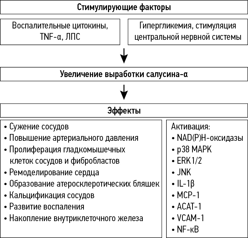 Салусин-β увеличивает активность никотинамидадениндинуклеотидфосфат (НАДФ, NADPH)-оксидазы и выработку активных форм кислорода (АФК, ROS) [11]. Кроме того, он активирует высвобождение воспалительных цитокинов, таких как как интерлейкин (IL) 1β, IL-6 и фактор некроза опухоли (TNF) α (рис. 2) [11].
