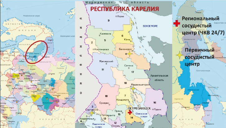 В Республике Карелии в 2008 г. в рамках модернизации системы здравоохранения созданы РСЦ в г. Петрозаводске на базе ГБУЗ РК «Республиканская больница им. В.А. Баранова» и 3 первичных сосудистых центра (ПСЦ) в городах Сортавала, Беломорск и Медвежьегорск на базе центральных районных больниц (рис. 1).