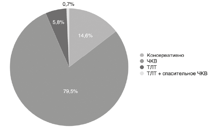 ТЛТ проведена 139 (5,8%) пациентам с ОКС с подъемом сегмента ST, среди них в 16 (11,5%) случаях ввиду неэффективности системного тромболизиса потребовалось выполнение спасительного ЧКВ. У 71,2% пациентов ТЛТ проведена в период £30 мин с момента первого контакта со службой здравоохранения. Среднее время от начала болевого синдрома за грудиной или его эквивалента до проведения ТЛТ больным с ОИМспST составило 150 мин. Результаты распределения пациентов с ОИМспST в зависимости от реперфузионной стратегии представлены на рис. 4.