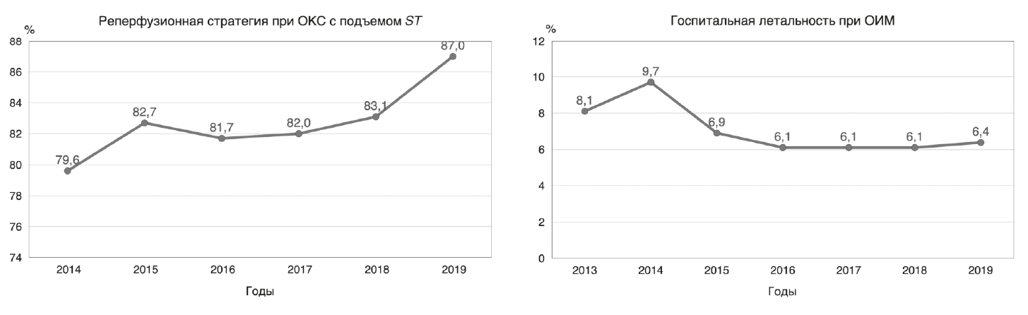 Анализ объема реперфузии в группе пациентов, переносящих ОИМспST, продемонстрировал рост числа вмешательств с 76,6 до 87,0% в динамике с 2014 по 2019 г. Подобная позитивная тенденция отмечается и в целом в России [12, 13]. Следует отметить, что параллельно с более активным внедрением реперфузионной стратегии наметилась отчетливая тенденция снижения смертности от ОИМ, которая в 2017–2019 гг. составила 6,1–6,4% (рис. 6).
