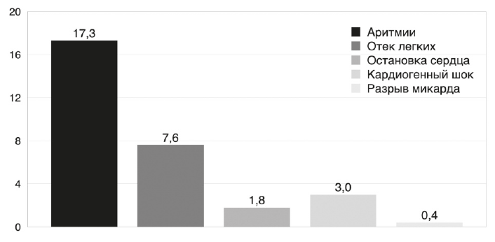 Несмотря на современные методы лечения и адекватную медикаментозную терапию, у пациентов, переносящих ОКС, сохраняется высокий риск развития жизнеугрожающих осложнений. По данным РСЦ, в реальной клинической практике тяжелые осложнения диагностированы у 24,8% больных. Среди них у 17,3% – жизнеугрожающие нарушения ритма, у 7,6% – отек легких, у 1,9% – остановка кровообращения, у 3,0% – кардиогенный шок, у 0,4% – разрыв миокарда. Однако на фоне лечения большинство осложнений удалось купировать, и госпитальная летальность при ОИМ составила 6,38%. Частота развития жизнеугрожающих осложнений у пациентов с ОКС представлена на рис. 7.