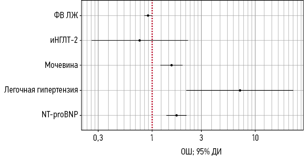2. Fig. 1. Odds ratio with 95% CI for the studied predictors. Note. ФВ ЛЖ — the left ventricular ejection fraction, иНГЛТ-2 — a type 2 sodium-glucose cotransporter inhibitor, NT-proBNP — N-terminal propeptide of brain natriuretic hormone, ОШ — odds ratio, ДИ — confidence interval.