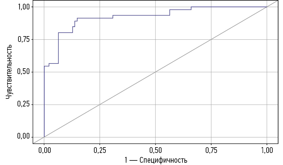 Статистический анализ производили при помощи статистического пакета прикладных программ SPSS v. 26.0 (IBM, США) и StatTech v. 3.1.10 (ООО «Статтех», Россия). Перед началом анализа количественных данных осуществляли их проверку на нормальность распределения (визуальный анализ гистограммы, асимметрия, эксцесс, коэффициент вариации, критерий Колмогорова–Смирнова). При распределении, близком к нормальному, данные представляли в виде среднего арифметического (M) и стандартного отклонения (SD), а при существенном отклонении от нормального распределения использовали медиану (Me) и интерквартильный размах (Q1–Q3). Различия считали статистически значимыми при р <0,05. Для клинически значимых эффектов рассчитывали отношение шансов (ОШ) с его 95% доверительным интервалом (ДИ). Построение прогностической модели вероятности определённого исхода выполняли при помощи метода логистической регрессии. Мерой определённости, указывающей на ту часть дисперсии, которая может быть объяснена с помощью логистической регрессии, служил коэффициент R² Найджелкерка. Для оценки диагностической значимости количественных признаков при прогнозировании определённого исхода применяли метод анализа ROC-кривых. Разделяющее значение количественного признака в точке cut-off определяли по наивысшему значению индекса Юдена.