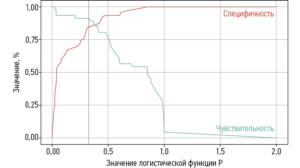 Рис. 3. Анализ чувствительности и специфичности модели в зависимости от пороговых значений логистической функции P.