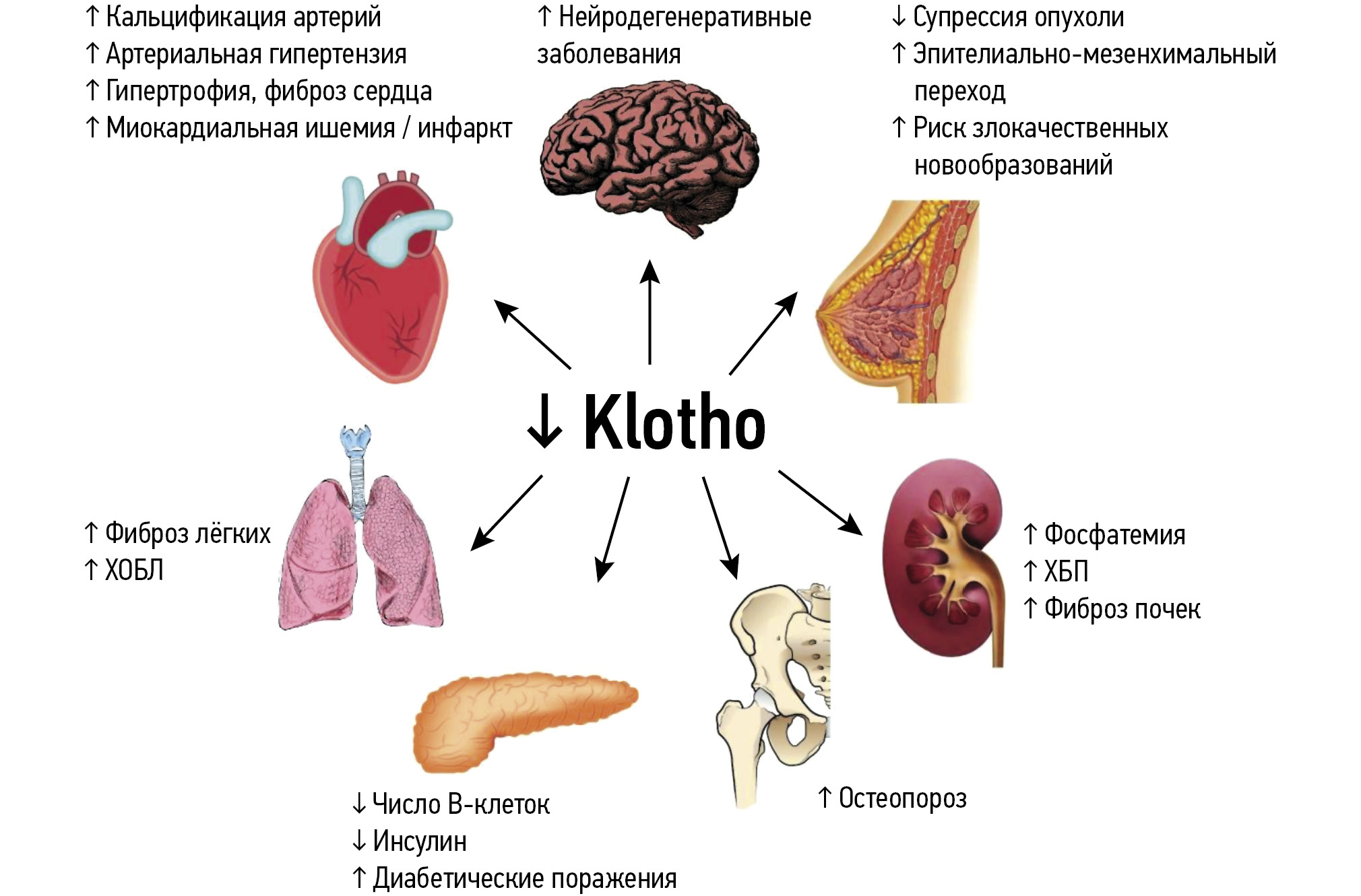 У грызунов с инсерционной мутацией в области промотора гена белка Klotho было выявлено ранее старение [6]. Гиперэкспрессия гена белка Klotho увеличивала продолжительность жизни у грызунов, что позволяет предположить, что он может функционировать как ген-супрессор старения [17]. Экспрессия Klotho снижается с возрастом; снижение содержания Klotho в крови, по-видимому, одинаково у мужчин и женщин [18]. Низкий уровень Klotho в крови ассоциирован с повышенной летальностью от всех причин [19]. Дефицит Klotho связан со многими возрастными заболеваниями. Как указано на рис. 1, пониженное содержание Klotho ассоциировано с гиперфосфатемией, хронической почечной недостаточностью, множественными ССЗ, нейродегенеративными заболеваниями, злокачественными новообразованиями, лёгочным фиброзом, хронической обструктивной болезнью лёгких (ХОБЛ), заболеваниями костей и сахарным диабетом (СД) [7, 9, 11, 13].