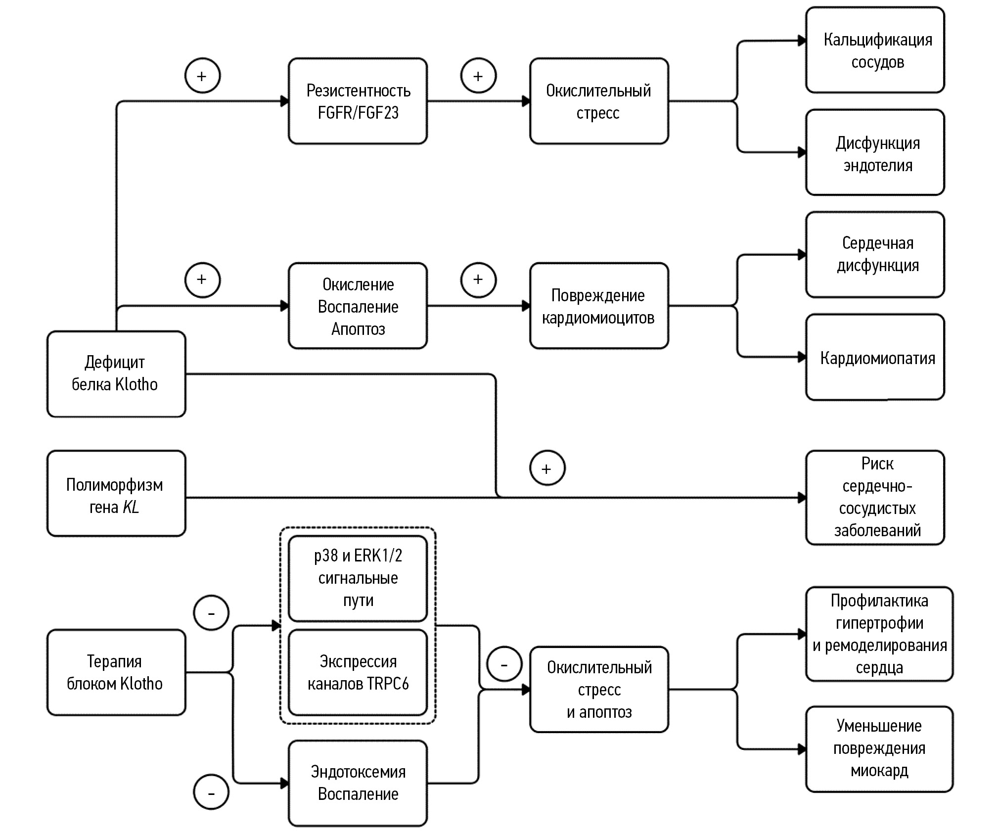 Согласно данным Y. Wang и соавт., Klotho может улучшить функцию сердца при старении, уменьшить окислительный стресс, воспаление и апоптоз, стимулируя поляризацию макрофагов M2a / M2c посредством ингибирования пути TLR4 (толл-подобный рецептор 4) / Myd88 (белок 88 миелоидной дифференцировки первичного генного ответа) / NF-κB [22]. X. Li и соавт. установили, что рекомбинантный Klotho подавлял воспалительную реакцию в миокарде у старых мышей с эндотоксемией, что приводило к восстановлению функции сердца [23]. J. Ding и соавт. продемонстрировали, что Klotho значительно ингибировал индуцированную Ang II экспрессию белка TGF-β1 в кардиомиоцитах и фибробластах сердца [24]. Эксперименты in vitro показали, что индуцированная Ang II гипертрофия кардиомиоцитов, а также пролиферация и активация фибробластов сердца заметно ингибировались Klotho [24]. Кроме того, Klotho уменьшал индуцированную Ang II экспрессию FGF23 in vivo и in vitro [24]. Klotho снижал содержание TGF-β1 в почечных тканях мышей, которым вводили Ang II [24]. K. Wang и соавт. показали, что Klotho оказывает кардиопротекторное действие при СН путём индукции аутофагии [ингибирование сигнального пути PI3K / AKT (протеинкиназа В) / mTOR (протеинкиназа серин-треониновой специфичности)] [25]. Согласно данным S. Kamel и соавт., ингибирование сигналов Klotho в сердце может усугубить кардиотоксичность, вызванную циклофосфамидом [26]. Исследование X. Zhuang и соавт. продемонстрировало, что Klotho уменьшает кардиотоксичность, вызванную доксирубицином, за счёт подавления апоптоза при участии белка, отвечающего за запуск митохондриального деления и участвующего в механизмах митохондриально-зависимого апоптоза (Drp1) [27].
