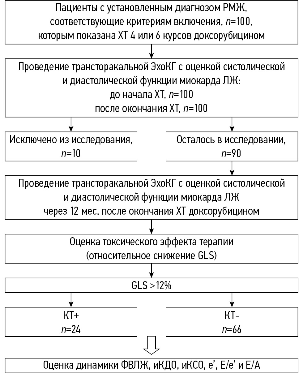 Рис. 1. Схема исследования. Примечание. РМЖ — рак молочной железы, GLS — глобальная продольная деформация миокарда, ЛЖ — левый желудочек, КТ+ — подгруппа с кардиотоксичностью, КТ- — подгруппа без кардиотоксичности, р — уровень значимости, n — число, ФВ ЛЖ — фракция выброса левого желудочка, ХТ — химиотерапия, ЭхоКГ — эхокардиография, иКДО — индексированный конечный диастолический объём, иКСО — индексированный конечный систолический объём, Е/А — отношение скоростей пиков раннего и позднего наполнения левого желудочка, Е/e’ — отношение скорости трансмитрального раннедиастолического кровотока и раннедиастолического пика движения латеральной части митрального фиброзного кольца, e’ — скорость раннедиастолического пика движения латеральной части митрального фиброзного кольца.