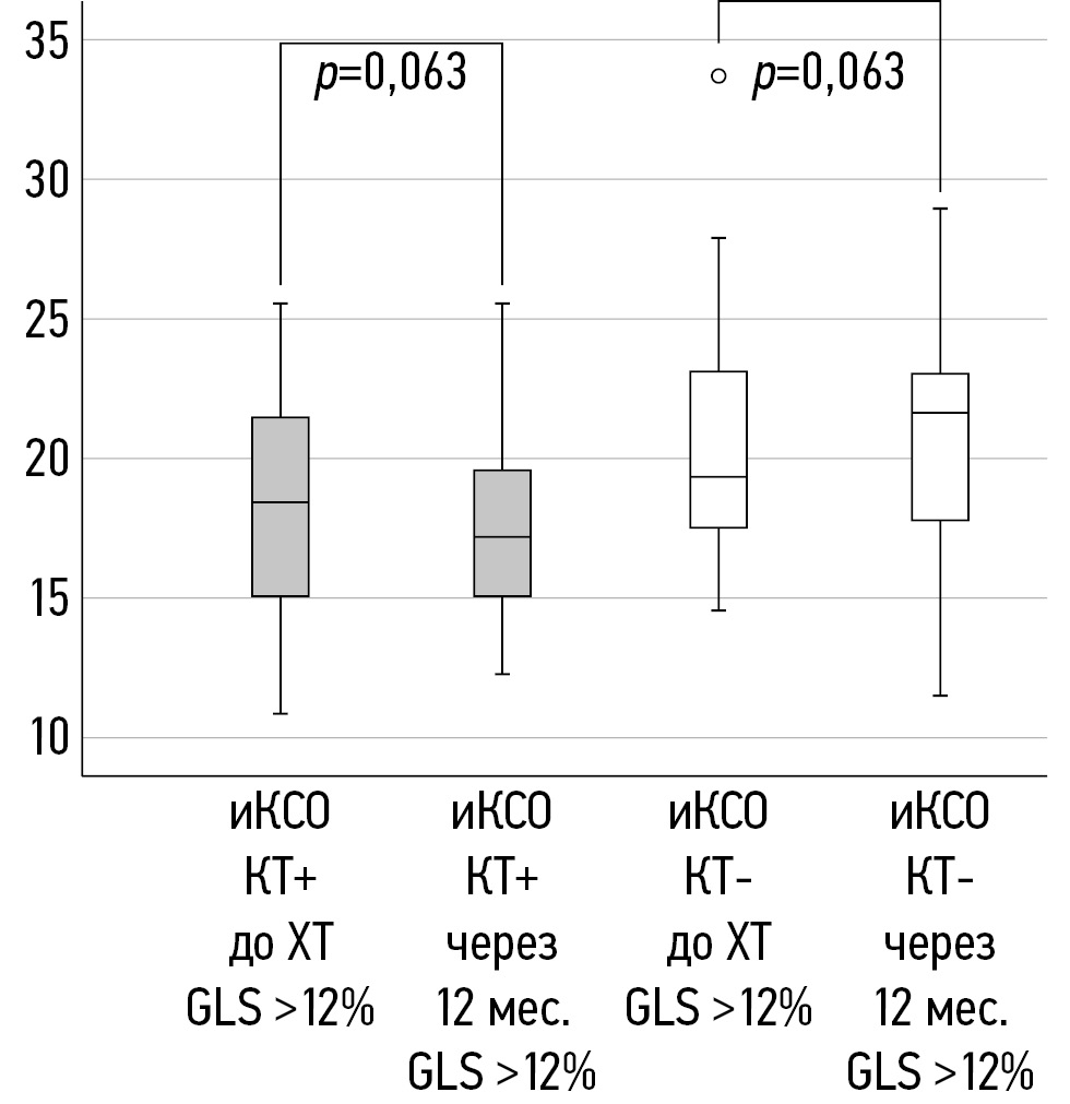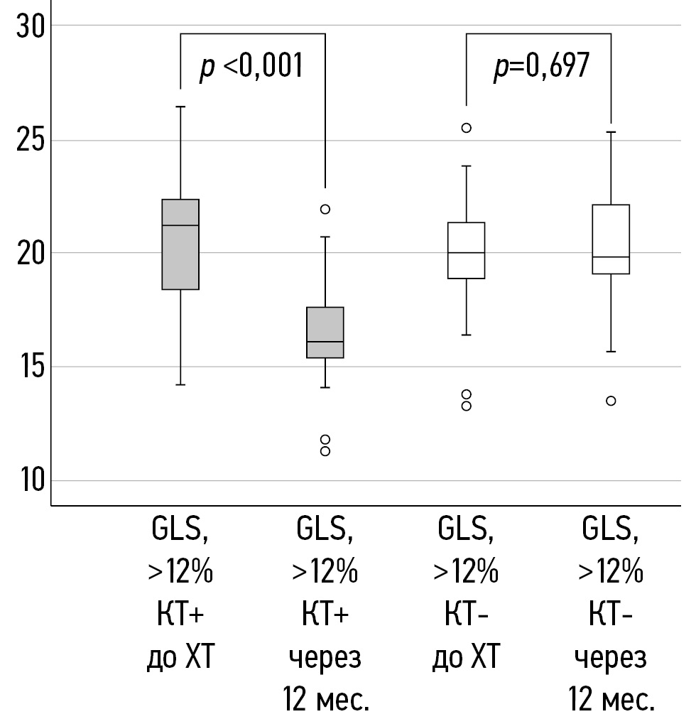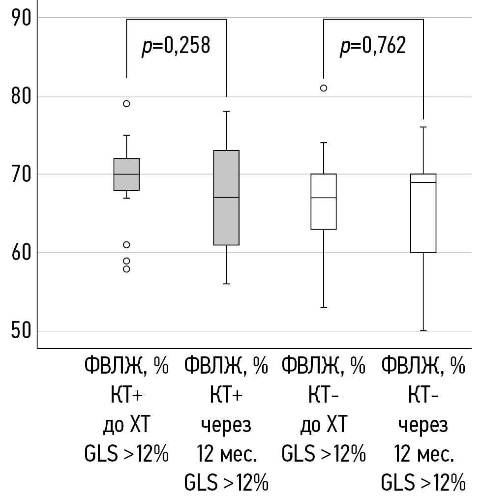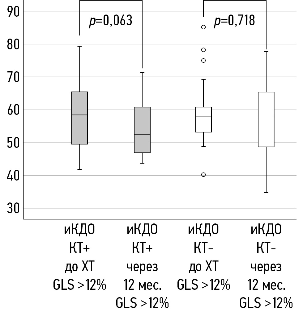 В соответствии со значением относительного снижения GLS >12% пациентки были разделены на 2 подгруппы с наличием КТ (КТ+) и без неё (КТ-). Женщины с относительным снижением ФВ ЛЖ >10% и абсолютным значением этого показателя <50% через 12 мес. после окончания ХТ не выявлены.