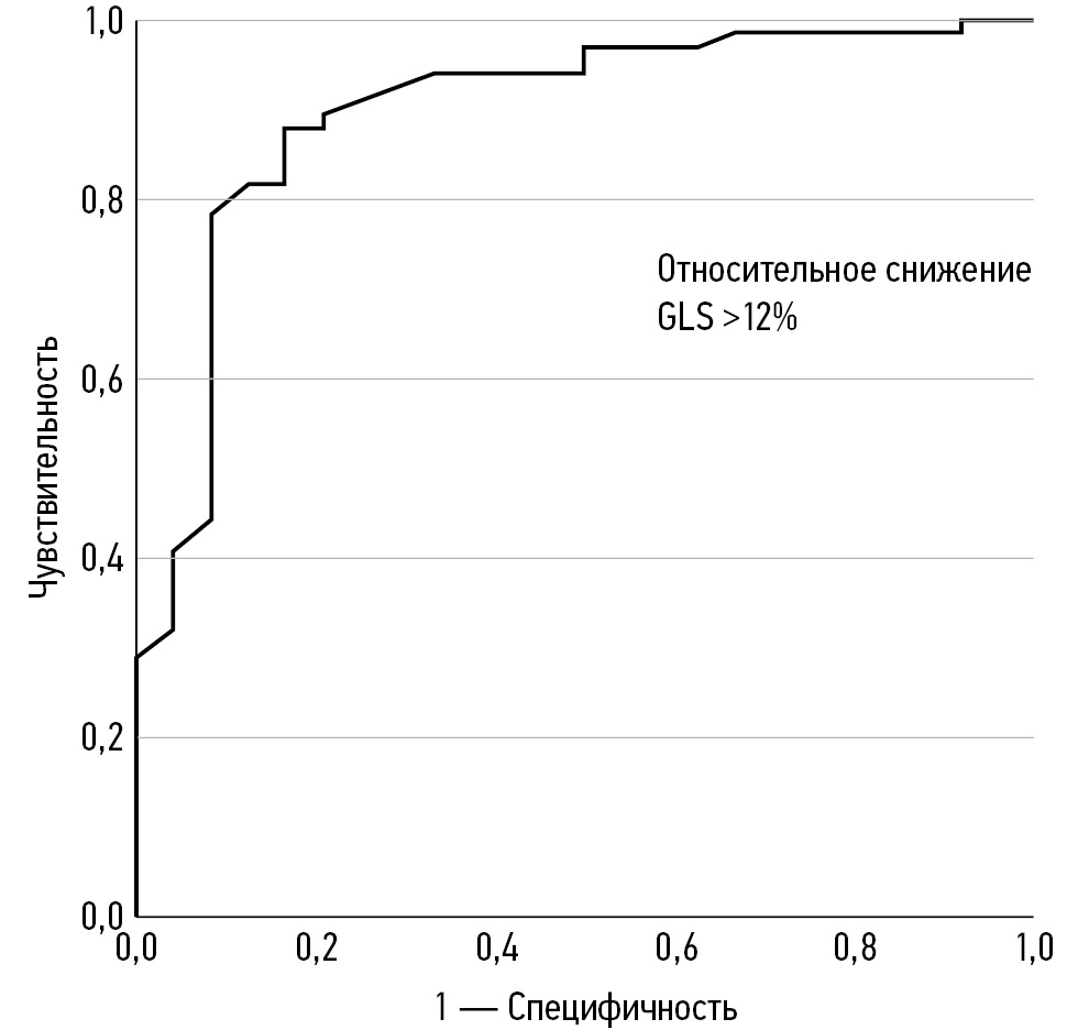 Использование относительного снижения GLS (%) является одним из наиболее перспективных направлений в диагностике ранней КТ и в ближайшем будущем может занять место «золотого стандарта». Однако в настоящее время всё ещё существуют некоторые ограничения, касающиеся применения этого подхода как самодостаточной диагностической процедуры в рутинной клинической практике. Среди них — выбор порогового значения относительного снижения GLS (>12%, >15% и прочие), а также неоднозначность подходов к использованию абсолютных пороговых значений GLS при разовом измерении показателя. В связи с этим изучение дополнительных клинических данных о применении абсолютных значений GLS и относительной динамики этого показателя, а также поиск иных потенциальных маркёров ранней КТ являются важными и актуальными задачами. В настоящем исследовании мы получили новые данные о связи абсолютных значений показателей иКДО, иКСО, Е/А и GLS c развитием ранней КТ.