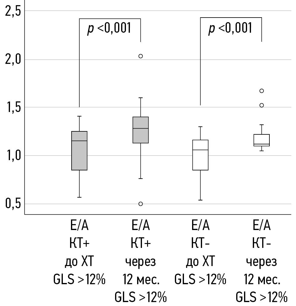 На основании полученных нами данных установлено, что наряду с GLS через 12 мес. после окончания ХТ статистически значимо изменяются и другие показатели систолической и диастолической функции. Важно отметить, что эти изменения показывают различия между подгруппами КТ+ и КТ-.