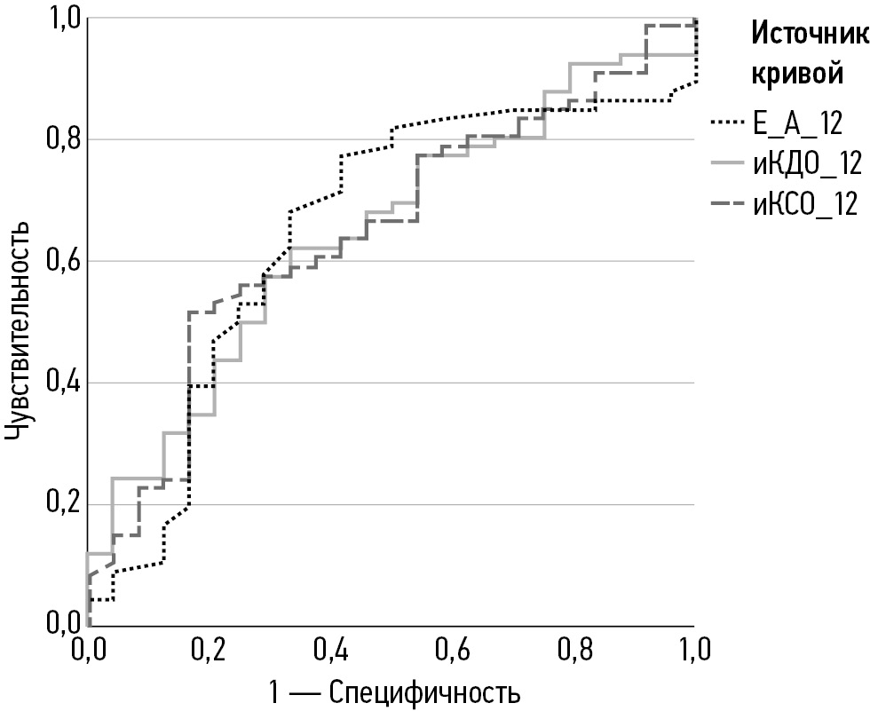 На основании данных построения ROC-кривых нами была проведена оценка чувствительности и специфичности использования E/A, иКДО и иКСО как показателей в качестве маркёров КТ через 12 мес., а также выявлены точки отсечения абсолютных значений. Полученные характеристики уступают по чувствительности и специфичности GLS, в связи с чем эти показатели на данном этапе исследований не могут считаться независимыми маркёрами КТ.