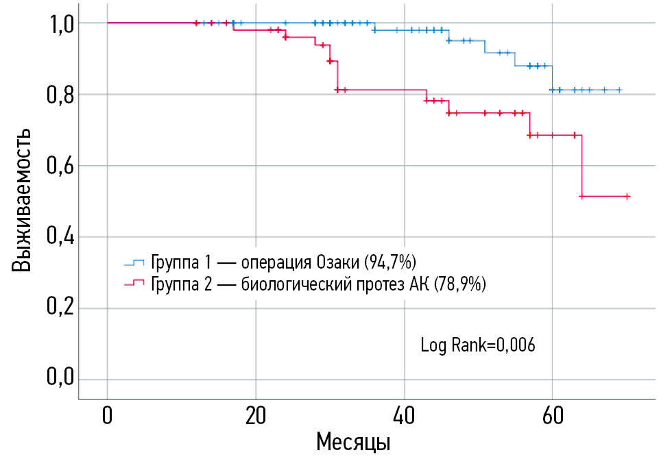 Был проведён анализ свободы от летального исхода в отдалённом периоде, построена кривая Каплана–Майера, по результатам которой выявлено, что выживаемость в группе пациентов с операцией Озаки лучше (Log Rank=0,006). Результаты представлены на рис. 1.