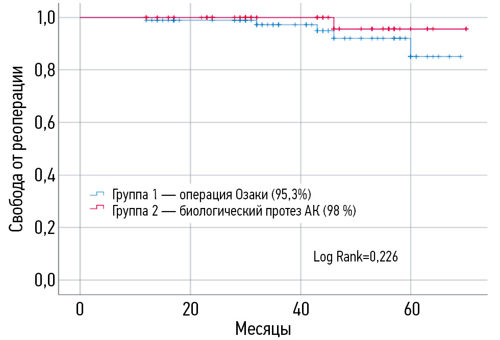 Вторичной конечной точкой в данном исследовании является реоперация. В первой группе выполнено 5 реопераций, во второй — одна. У больных, которым была выполнена процедура Озаки, причиной повторной операции в трёх случаях являлась перфорация створок, покрытых кальцинозом, и по одному случаю — паннус и фистула левой коронарной створки в левое предсердие. Данные пациенты успешно прооперированы в нашей клинике повторно. Пациентам были выполнены следующие виды реопераций: в двух случаях — трансаортальная имплантация аортального клапана «МедЛаб-КТ», в одном случае — протезирование корня аорты гомографтом и в двух случаях — репротезирование механическим протезом. В группе 2 причиной реоперации был абсцесс корня аорты, больному выполнили процедуру Бенталла–Де Боно. Для оценки свободы от реоперации в отдалённом периоде построена кривая Каплана–Мейера.