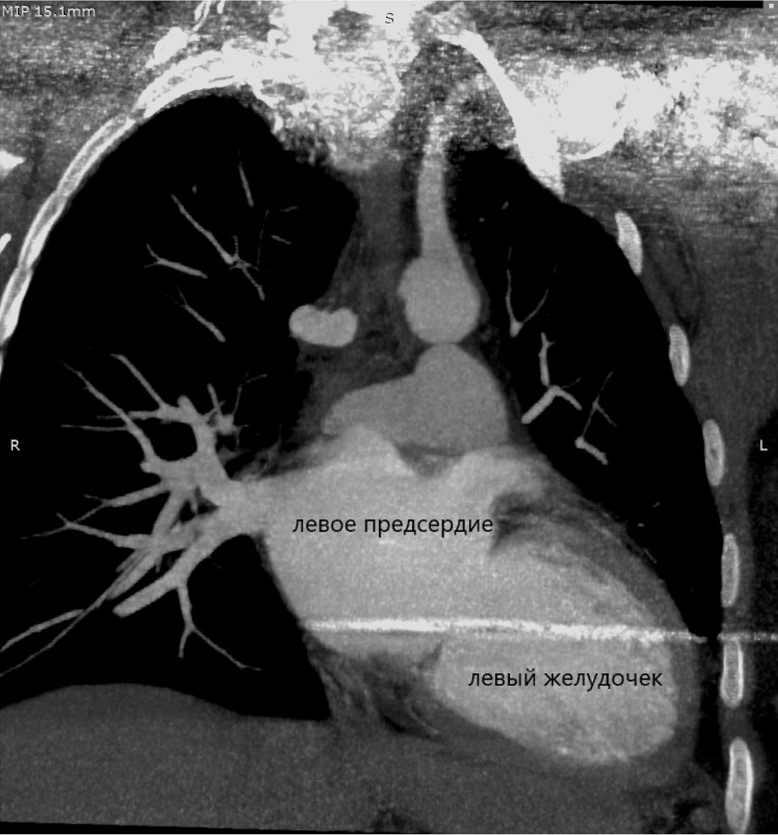 Рис. 4. Компьютерная томограмма пациентки К. Дилатация левых отделов сердца, пристеночные тромботические отложения в полости левого желудочка.