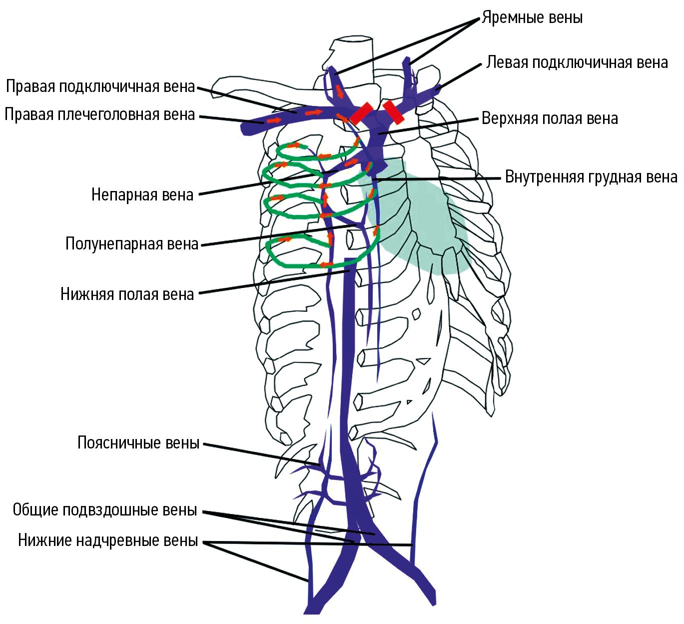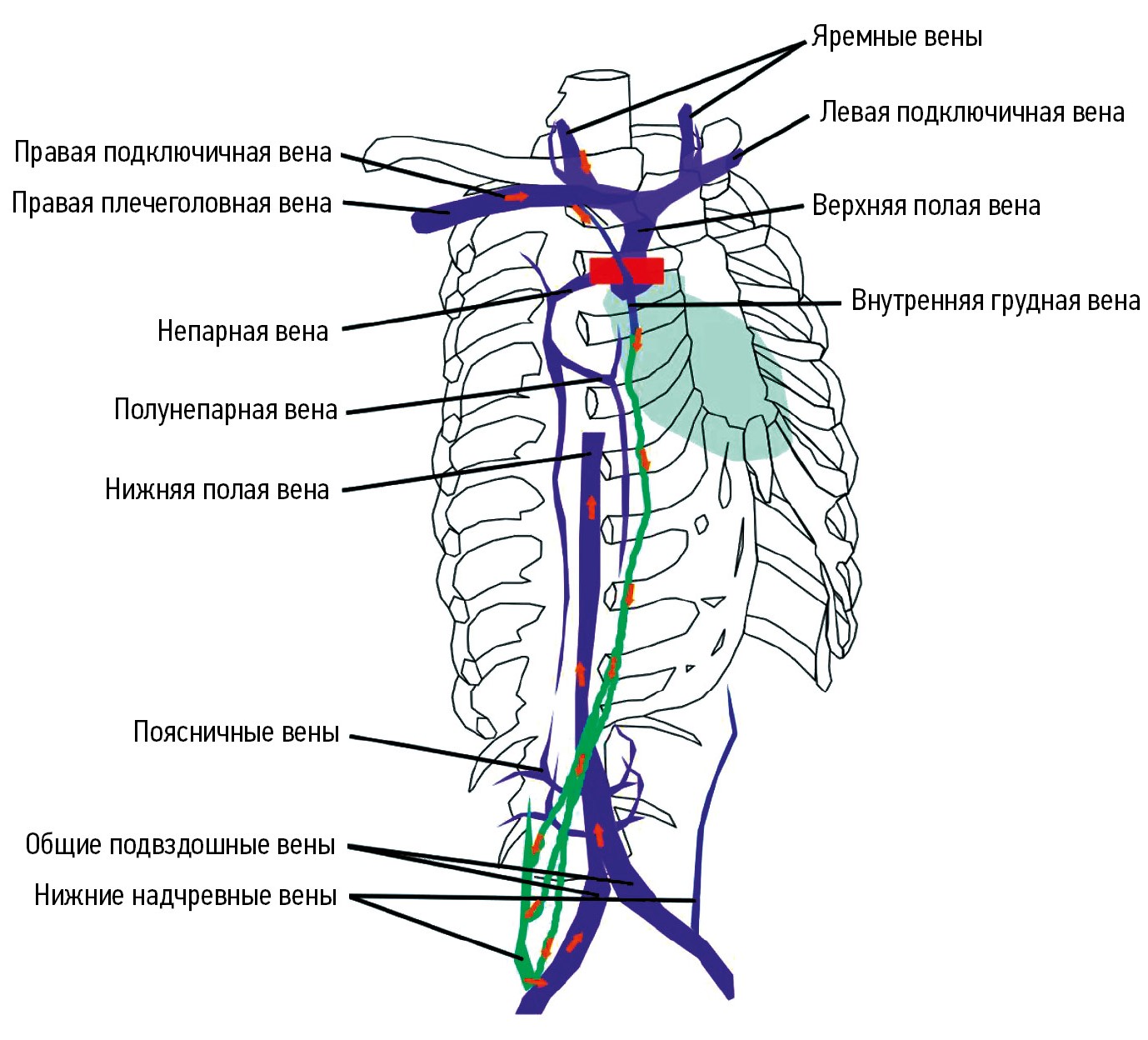 Верхняя полая вена (ВПВ) является крупнейшей веной средостения, образуется в результате слияния левой и правой безымянных (брахиоцефальных) вен и собирает кровь от головы, шеи и верхней части тела, стенок и органов грудной полости и частично стенок брюшной полости. Синдром ВПВ возникает в результате обструкции кровотока в ВПВ, которая может быть вызвана либо внешней компрессией, либо внутренней закупоркой тромбом или опухолевой инфильтрацией. В 60% случаев это связано со злокачественными новообразованиями, такими как лимфома, мелкоклеточный и немелкоклеточный рак лёгких, а также с метастатическими поражениями [1].