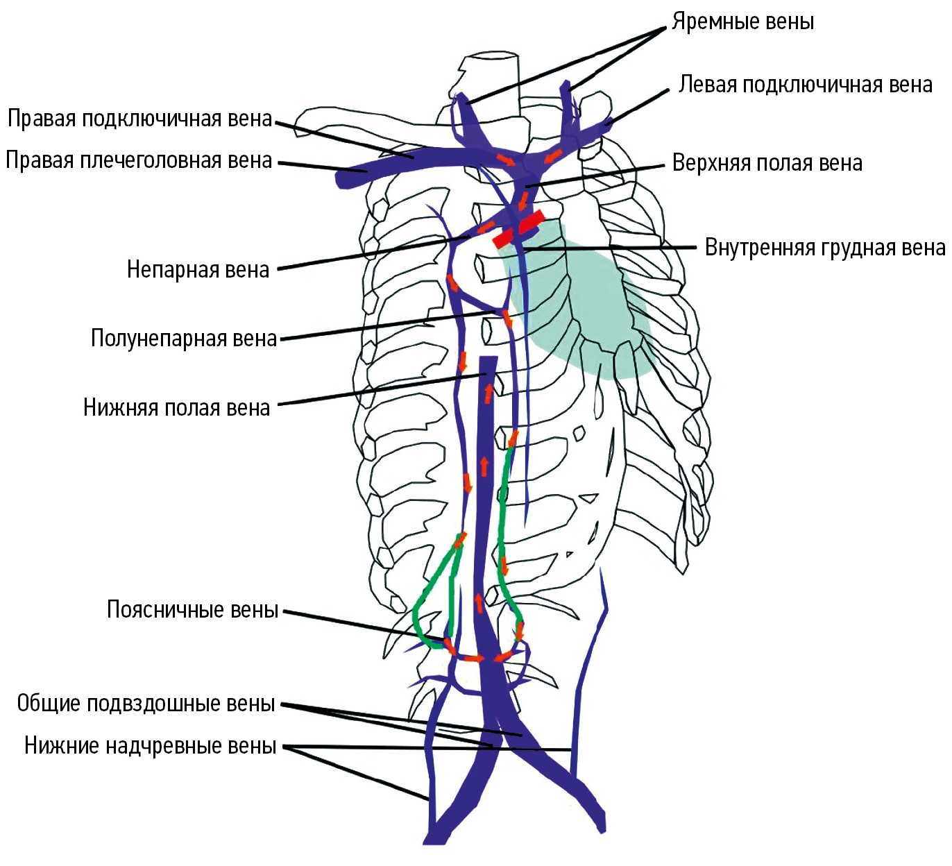 Рис. 5. Коллатеральное кровообращение при тромбозе верхней полой вены выше уровня отхождения непарной вены с вовлечением плечеголовных вен (рисунок создан автором статьи с использованием приложения Inkscape).