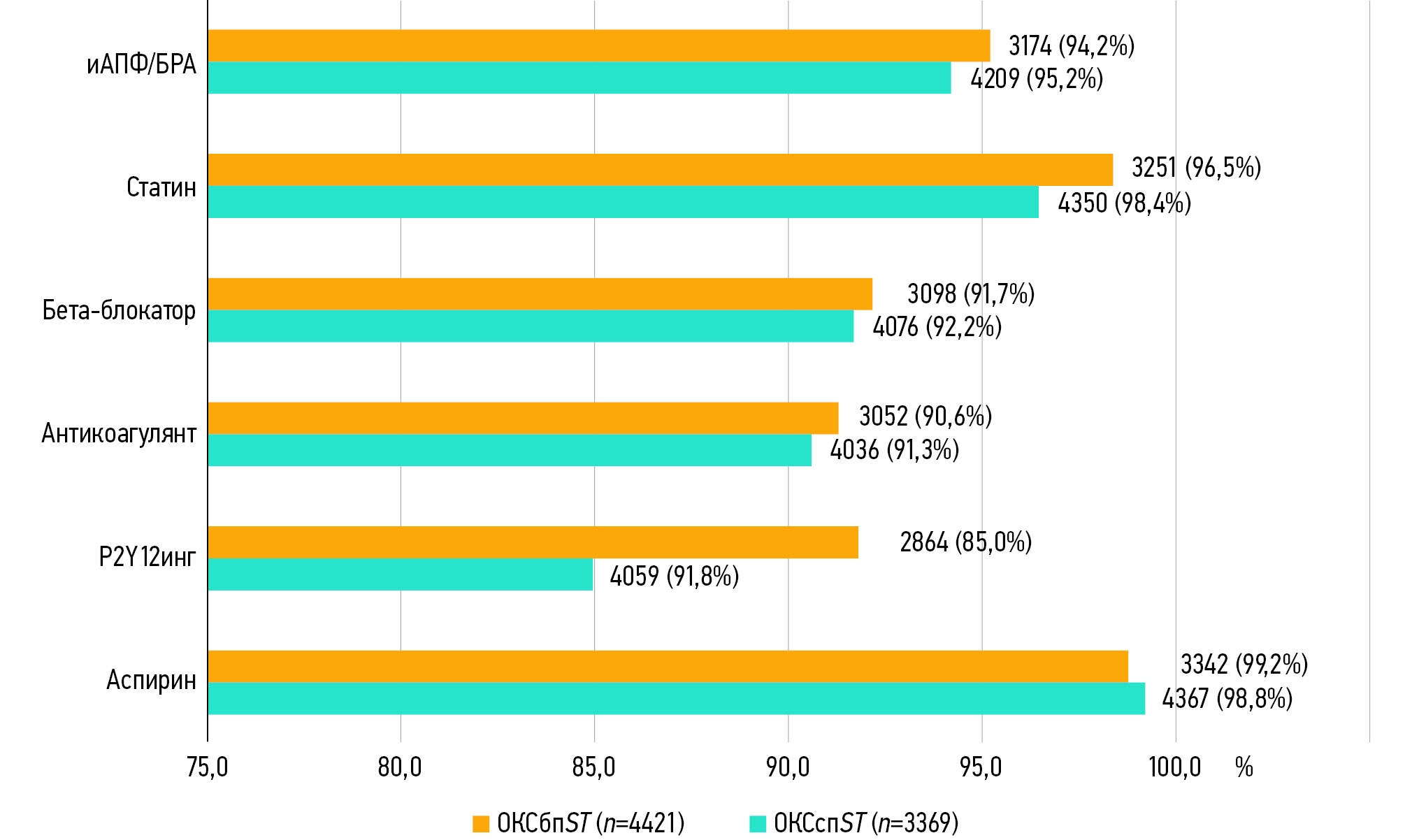 В группе больных с ОКСбпST (n=4421) аспирин принимали 4367 (98,8%) пациентов [догоспитальная инициация терапии в 3241 (74,2%) случае], ингибитор P2Y12 — 4059 (91,8%) [догоспитальное начало у 1765 человек (43,5%)], антикоагулянт — 4036 (91,3%), иАПФ/БРА — 4209 (95,2%), статин — 4350 (98,4%), β-блокатор — 4076 (92,2%) (из них в 147 (3,6%) случаях применили внутривенное введение).