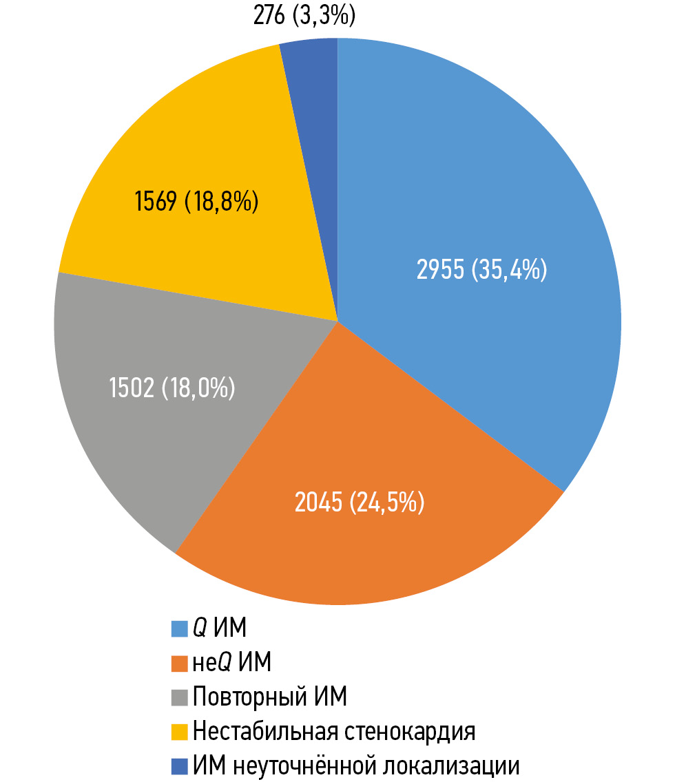Исходами ОКС в исследуемой нами группе оказались следующие. Острый инфаркт миокарда (ИМ) c зубцом Q диагностирован у 2955 (35,4%) пациентов, ИМ без зубца Q — у 2045 (24,5%), повторный ИМ — у 1502 (18,0%). 1569 (18,8%) больных выписаны с диагностическим представлением о нестабильной стенокардии. Ещё у 276 (3,3%) диагностирован ИМ неуточнённой локализации (рис. 2).