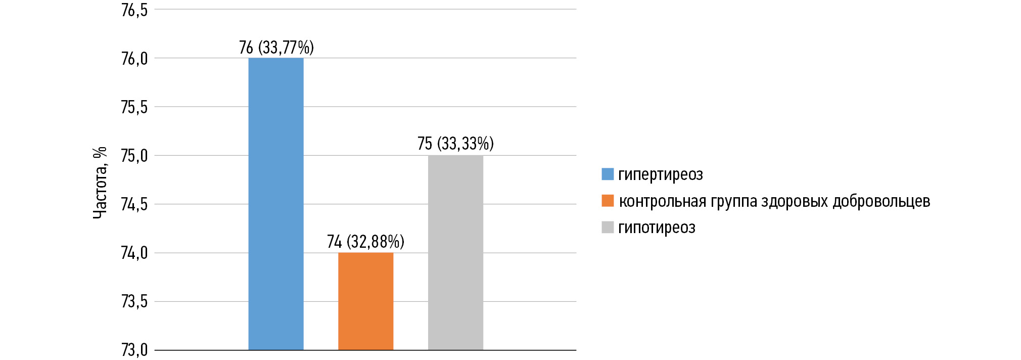 При выполнении статистического анализа использовали программное обеспечение SPSS версии 23 («АйБиЭм Корпорейшн» (IBM Corporation), Армонк, штат Нью-Йорк, США). Нормальность распределения данных оценивали с помощью критерия Колмогорова–Смирнова. Сравнение непрерывных переменных между группами пациентов с гипотиреозом или гипертиреозом и контрольной группой проводили посредством однофакторного дисперсионного анализа. Результаты представлены в виде среднего значения±стандартное отклонение (среднее±SD) для непрерывных переменных и в виде n (%) для категориальных переменных. При сравнении категориальных переменных использовали критерий хи-квадрат. Для анализа корреляций между переменными применяли коэффициент корреляции Пирсона при уровне значимости p <0,05.
