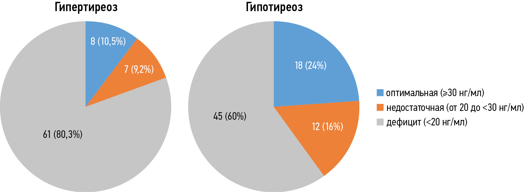 Рис. 2. Распределение пациентов с гипертиреозом и гипотиреозом в зависимости от концентрации 25-гидроксивитамина D, т. е. оптимальной (≥30 нг/мл), недостаточной (от 20 до <30 нг/мл) и соответствующей дефициту (<20 нг/мл).