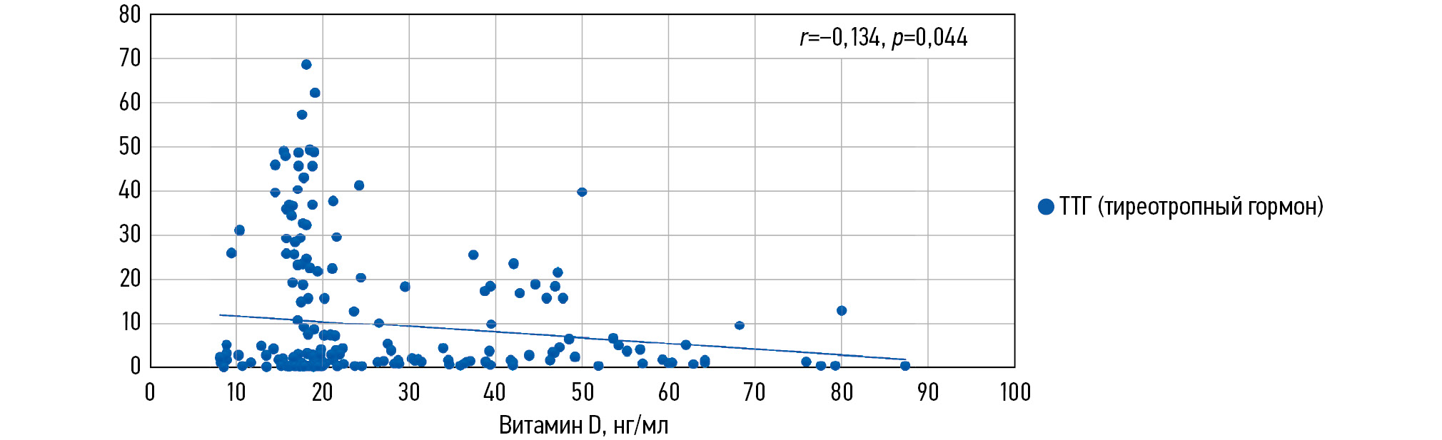 Рис. 3. Диаграмма рассеяния, иллюстрирующая результаты анализа корреляций между содержанием витамина D и концентрацией тиреотропного гормона.