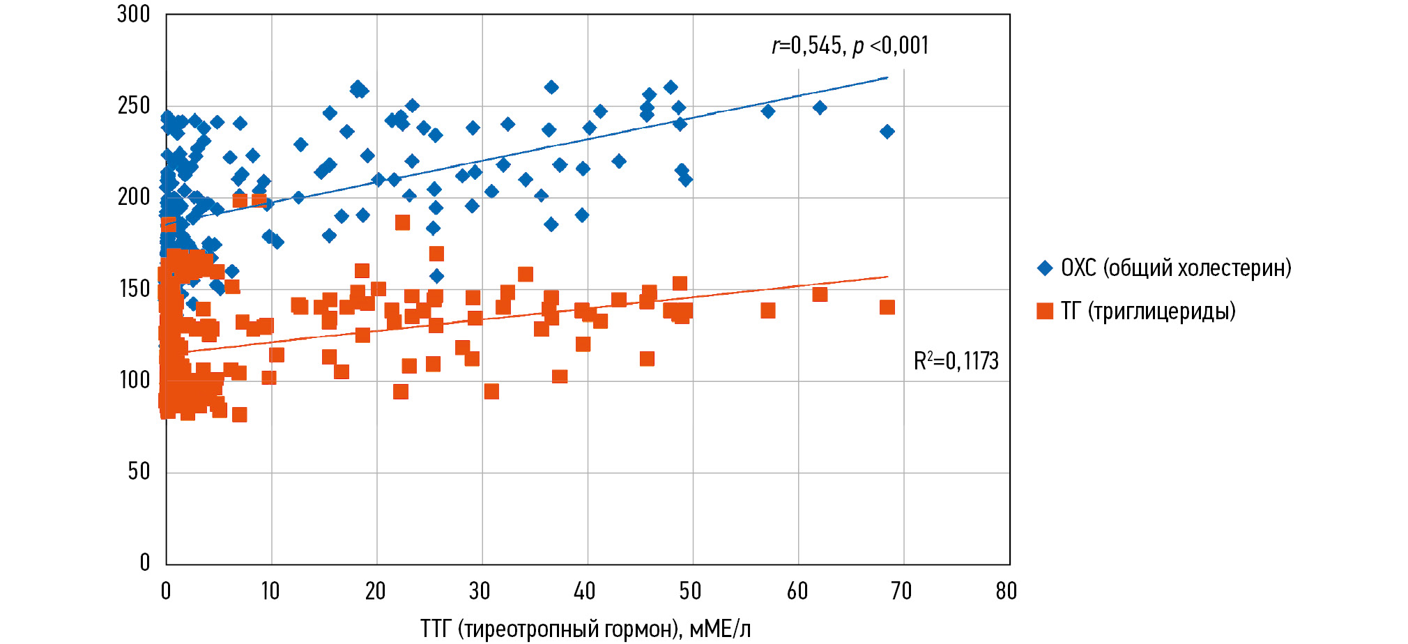 Согласно результатам корреляционного анализа, повышение концентрации ТТГ в сыворотке крови статистически значимо и положительно коррелировало с ИМТ, концентрациями ОХС, ТГ, ЛПНП и ЛПОНП у всех участников. Это связано с тем, что гормоны щитовидной железы регулируют важнейшие функции организма, такие как расщепление жиров и утилизацию энергии. Высокая концентрация ТТГ часто указывает на сниженную функцию щитовидной железы, которая не вырабатывает достаточного количества гормонов. В этом случае гипотиреоз вызывает нарушение метаболизма жиров и повышение концентраций холестерина, триглицеридов, ЛПНП и ЛПОНП в крови. Баланс гормонов щитовидной железы оказывает существенное влияние на метаболизм и концентрации липидов [26]. Эти наблюдения согласуются с данными John P. Walsh и соавт. [31], которые сообщили о повышении содержания ТТГ и положительной корреляции этого показателя с концентрациями ОХС, ТГ, ЛПНП и ЛПОНП. В другом исследовании у пациентов с сахарным диабетом 2-го типа отмечалась положительная и выраженная корреляция между концентрацией ТТГ и показателями липидограммы, за исключением ЛПВП [32]. Кроме того, результаты настоящего исследования указывают на то, что концентрация ТТГ отрицательно коррелирует с содержанием витамина D и положительно коррелирует с концентрацией ЛПВП. Эти результаты соответствуют данным других исследований по оценке зависимости между гипотиреозом и снижением концентрации витамина D, что дополняет доказательства связи между гипотиреозом, дефицитом витамина D и повышенным риском развития сердечно-сосудистых заболеваний (ССЗ) [33]. В недавнем исследовании авторы изучали взаимосвязь между содержанием витамина D, показателями липидограммы и результатами лабораторных анализов функции щитовидной железы. Полученные данные свидетельствовали об отсутствии статистически значимой отрицательной корреляции между содержанием витамина D и концентрациями свободного Т3, свободного Т4 при гипотиреозе и большинством показателей липидограммы, за исключением ЛПВП. Однако было установлено, что содержание витамина D характеризуется статистически значимой отрицательной корреляцией с концентрацией ТТГ, а также статистически значимой положительной корреляцией с концентрацией ЛПВП. Следует отметить, что в предыдущем исследовании Wang и соавт. (2016 г.) была обнаружена сильная корреляция между содержанием витамина D и показателями липидограммы. Эти результаты соответствуют данным других опубликованных исследований, согласно которым дефицит витамина D связан с увеличением риска развития сердечно-сосудистых заболеваний и смертности при повышенном содержании липидов в крови [34, 35].