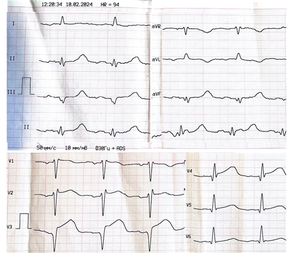 Пациентка Ч., 76 лет, поступила в экстренном порядке в приёмный покой клиники с диагнозом «ишемическая болезнь сердца, острый коронарный синдром с подъёмом сегмента ST от 10.02.2024 г., осложнённый развитием кардиогенного шока». На момент поступления сбор жалоб и анамнеза был невозможен по причине тяжести состояния больной, однако со слов бригады скорой помощи стало известно, что у пациентки в магазине ориентировочно в 11:30 внезапно появились жалобы на резкую слабость, тошноту, чувство нехватки воздуха, потемнение в глазах, интенсивную сжимающую боль за грудиной без иррадиации. Скорую помощь вызвали сотрудники магазина.
