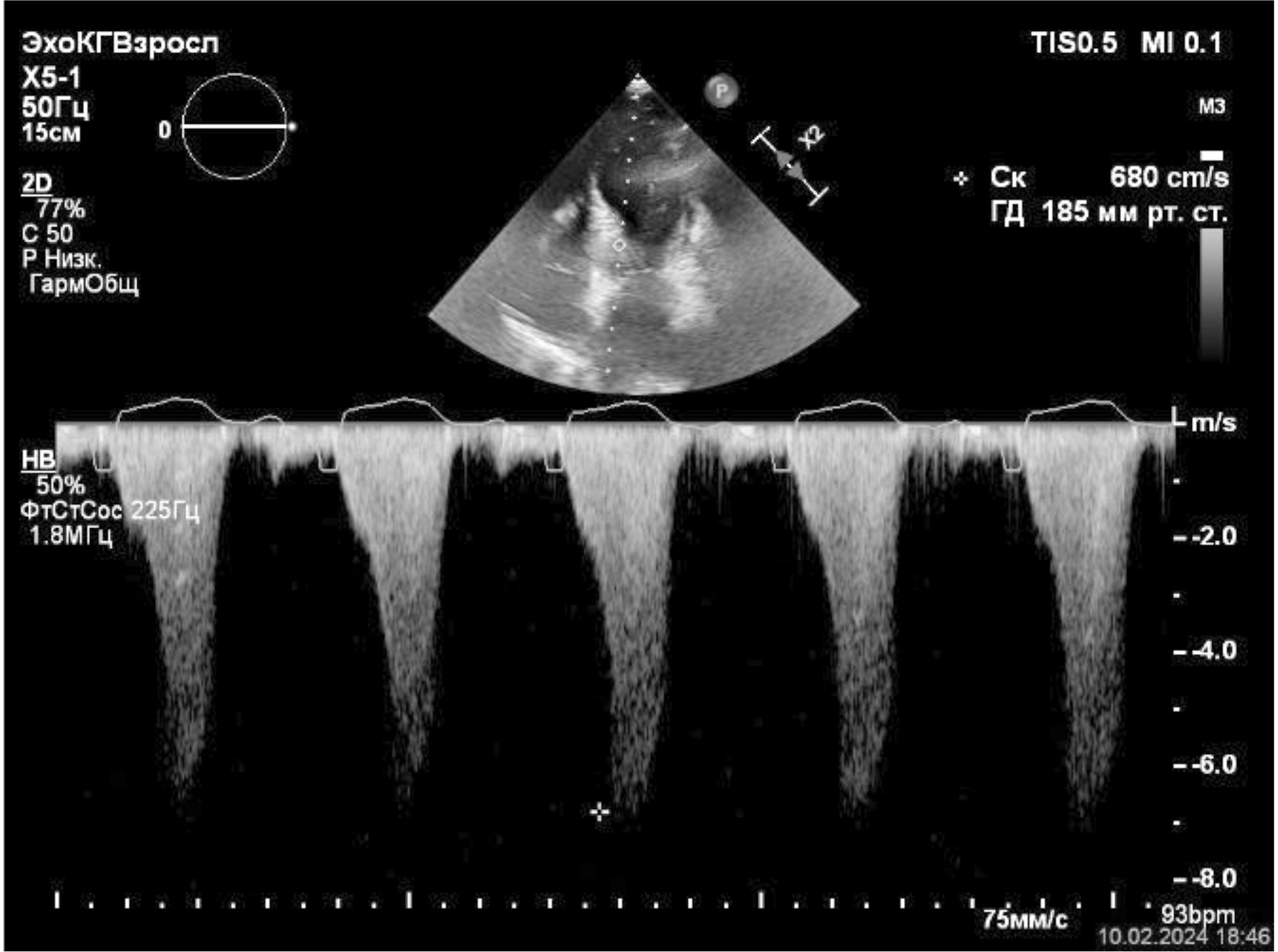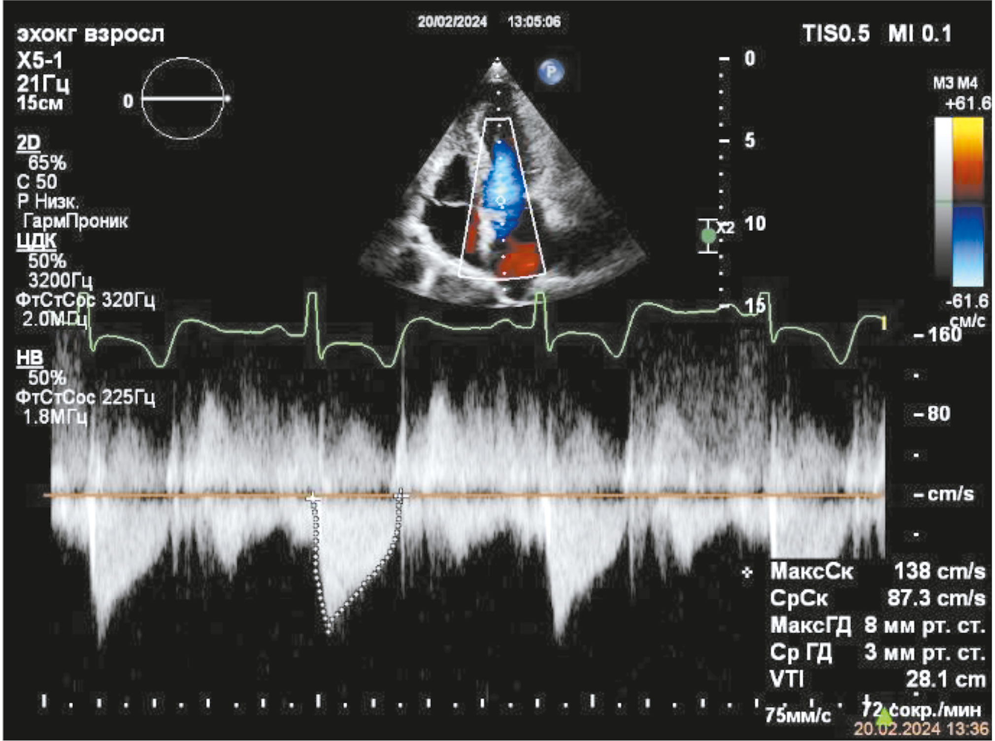 Рис. 6. Эхокардиография на десятые сутки госпитализации: градиент на выходном тракте левого желудочка.