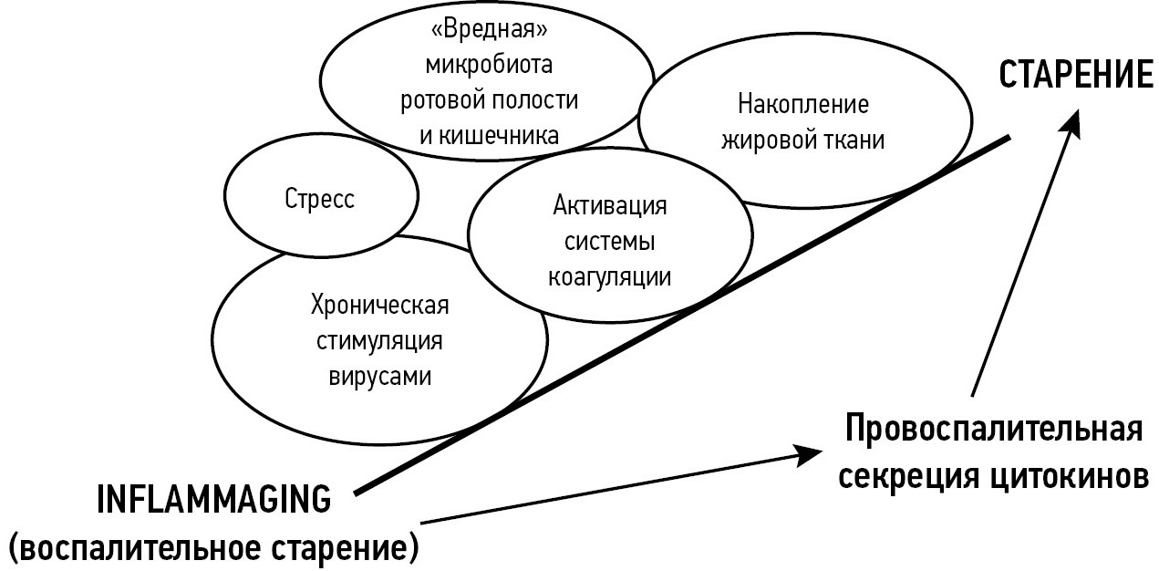 В 2000 году профессор С. Franceschi впервые описал явление, которое получило название «воспалительное старение» или «inflammaging». Оно характеризуется хроническим слабовыраженным воспалением, которое развивается у лиц старшего возраста и связано с нарушениями в их иммунной системе. Это воспаление может возникать без определённой инфекции и способствовать проявлениям других возрастных патологий [3]. Факторами, способствующими формированию воспаления, являются возраст-ассоциированное уменьшение влияния на вирусы адаптивной иммунной системы, вредные продукты, производимые микробиотой кишечника и ротовой полости, накопление адипозной ткани, ведущее к избыточному синтезу интерлейкинов-6, -12 (ИЛ-6, -12) и фактора некроза опухоли альфа (ФНО-альфа), а также активация системы коагуляции с возрастом (рис. 1) [5].