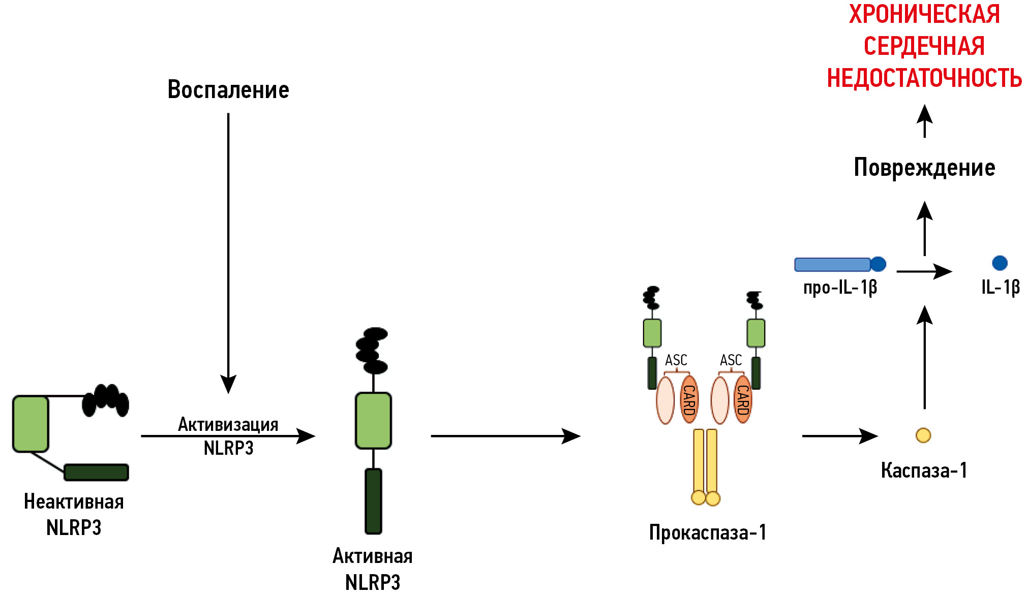 Другими механизмами, способствующими воспалению, являются аутофагия и активация инфламмасом. Аутофагия рассматривается как клеточный процесс, устраняющий цитоплазматические отходы и повреждённые компоненты путём формирования аутофагосомы. Потеря эффективных аутофагических процессов с возрастом приводит к агрегации повреждённых белков [10]. Инфламмасома, являющаяся мультибелковым комплексом, обнаруживает такие белки и активизируется, что приводит к разрыву клетки или пироптозу с выделением провоспалительных цитокинов. В настоящее время в контексте сердечно-сосудистой патологии наиболее изучена инфламмасома NLRP3 (NLR family, pyrin domain-containing 3), являющаяся ключевым регулятором иммуновоспалительного пути развития сердечно-сосудистых заболеваний [11]. В американском исследовании формирования инфламмасомы на мышах, перенёсших острый инфаркт миокарда (ОИМ), было доказано её негативное влияние на ремоделирование желудочков, приводящее к развитию сердечной недостаточности [12]. Такое неблагоприятное влияние обусловливается следующими событиями. В ответ на повреждение при ишемии в ткань устремляются белые кровяные тельца врождённой иммунной системы — макрофаги. Вне повреждения они находятся в стабильном состоянии, но при сердечной недостаточности, ввиду диастолической дисфункции, количество макрофагов увеличивается за счёт системной мобилизации фагоцитов из отдалённых участков при активации кроветворения в костном мозге и селезёнке [9, 13]. Пытаясь «переварить» повреждённые клетки, макрофаги образуют фаголизосому, которая при избыточном поглощении веществ способствует разрушению клеточной оболочки. Всё это приводит к активации NLRP3: меняя свою структуру при использовании адаптерного белка ASC (апоптозассоциированный Speck-подобный белок, содержащий домен CARD), образуется инфламмасома — мультибелковый комплекс, необходимый для активации каспазы-1 и высвобождения ИЛ-1β. Каспаза-1 является ключевым модулятором воспалительной реакции в ответ на повреждение ткани и участвует в стимулировании гибели клеток. Экспериментальные исследования на мышах с генетической делецией каспазы-1 идентифицировали ингибирование каспазы-1 как потенциальную мишень для фармакологического вмешательства при ОИМ [12].